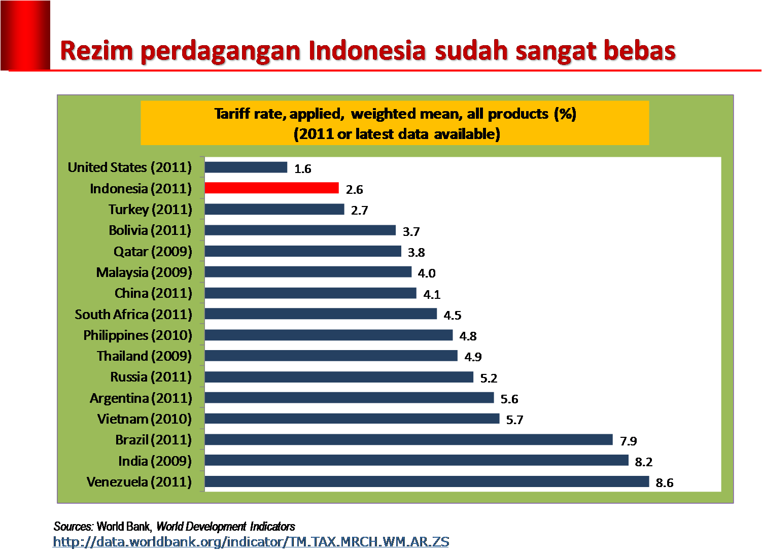 Liberalisasi perdagangan di Indonesia menderu relatif lebih kencang. Data versi pemerintah lebih tinggi karena berdasarkan tarif nominal most favored nation (MFN), sedangkan Bank Dunia berdasarkan tarif efektif (lebih jelasnya bisa dilihat pada keterangan di bawah Peraga). Kedua versi menunjukkan kecenderungan yang sama, yakni akselerasi penurunan tarif bea masuk.