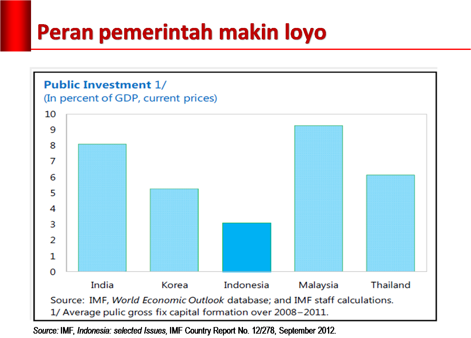 Mengapa India yang lebih miskin dari kita bisa menggelontorkan investasi publik sampai sekitar 8 persen PDB, jauh lebih besar dari Indonesia yang hanya sekitar 3 persen PDB saja. Malaysia dan Thailand juga lebih tinggi dari Indonesia, masing-masing sekitar 9 persen PDB dan 6 persen PDB.