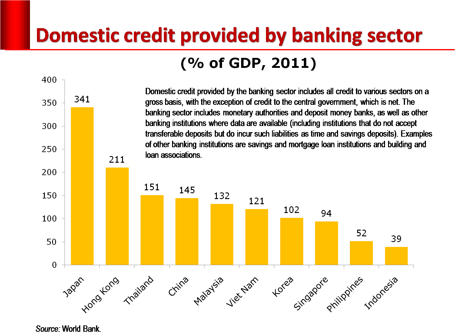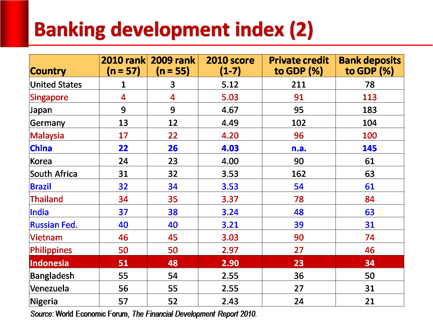 Khusus untuk perbankan, baik deposit to GDP ratio (yang mencerminakan daya menyedot dana dari masyarakat) maupun credit to GDP ratio (yang daya memompakan kembali dana ke masyarakat) sama-sama rendah. Bahkan untuk yang kedua tergolong paling rendah di dunia.