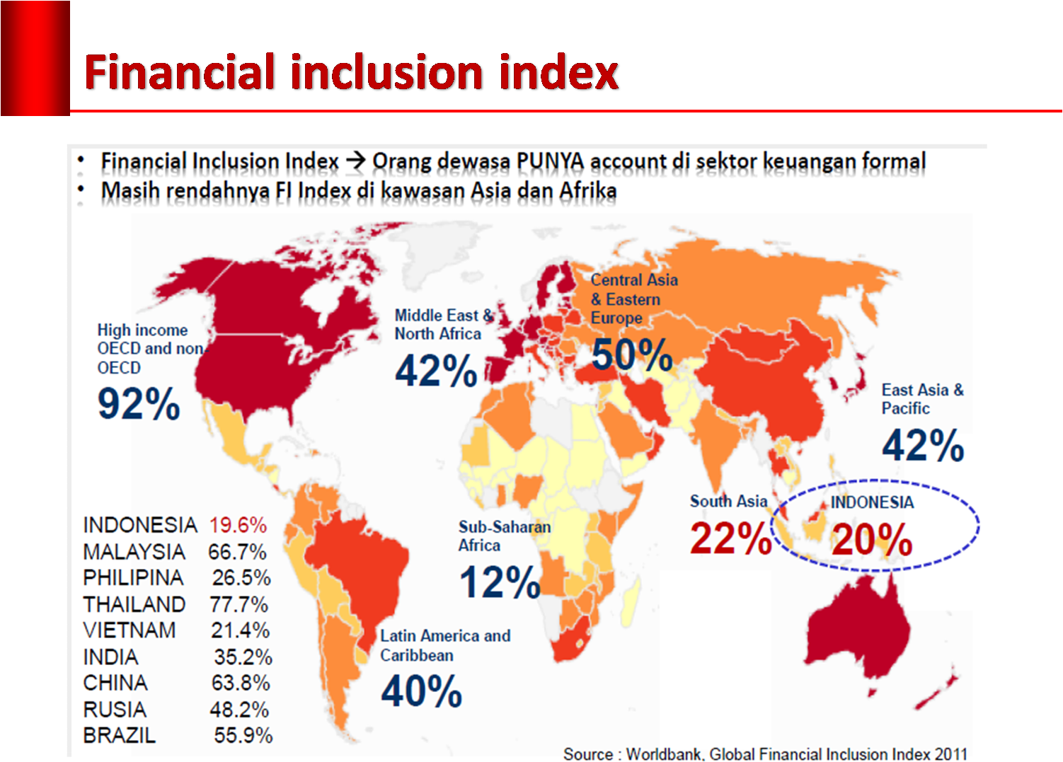 Darah yang tersedia di dalam sistem keuangan Indonesia masih sangat sedikit. Tercermin dari jumlah orang dewasa yang memiliki akun di lembaga keuangan formal. Ukuran yang lazim dipakai adalah financial inclusion index.