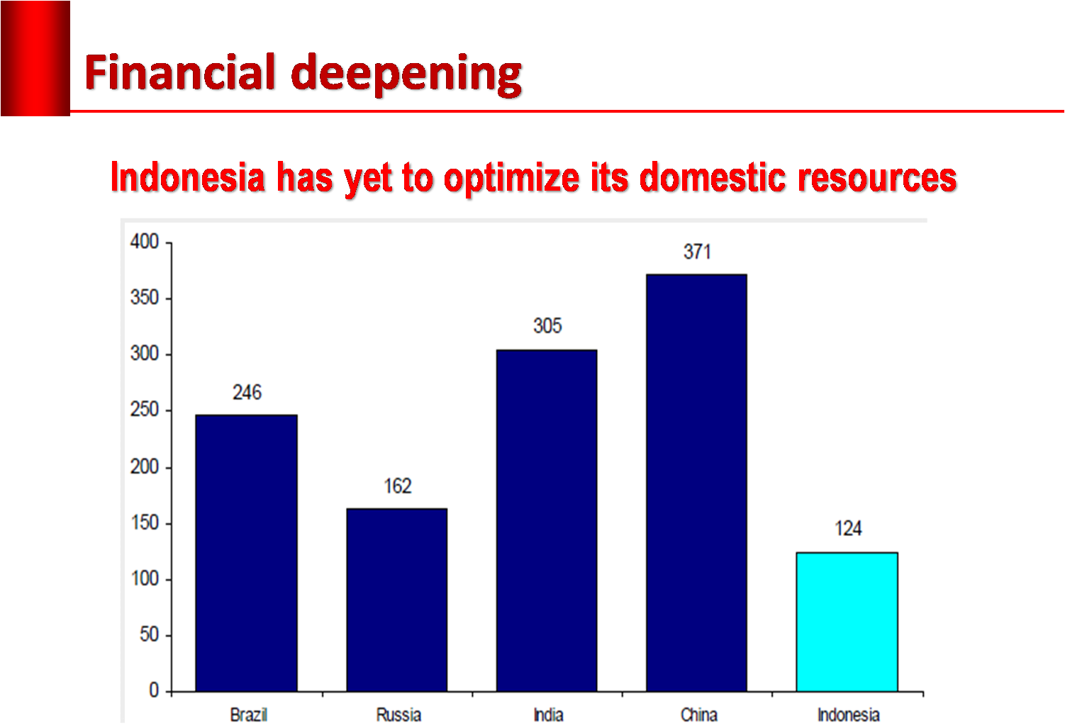 Memang, kedalaman sektor keuangan Indonesia masih cetek. Tak hanya subsektor perbankan, melainkan juga semua subsektor keuangan lainnya, yaitu pasar obligasi dan bursa saham.
