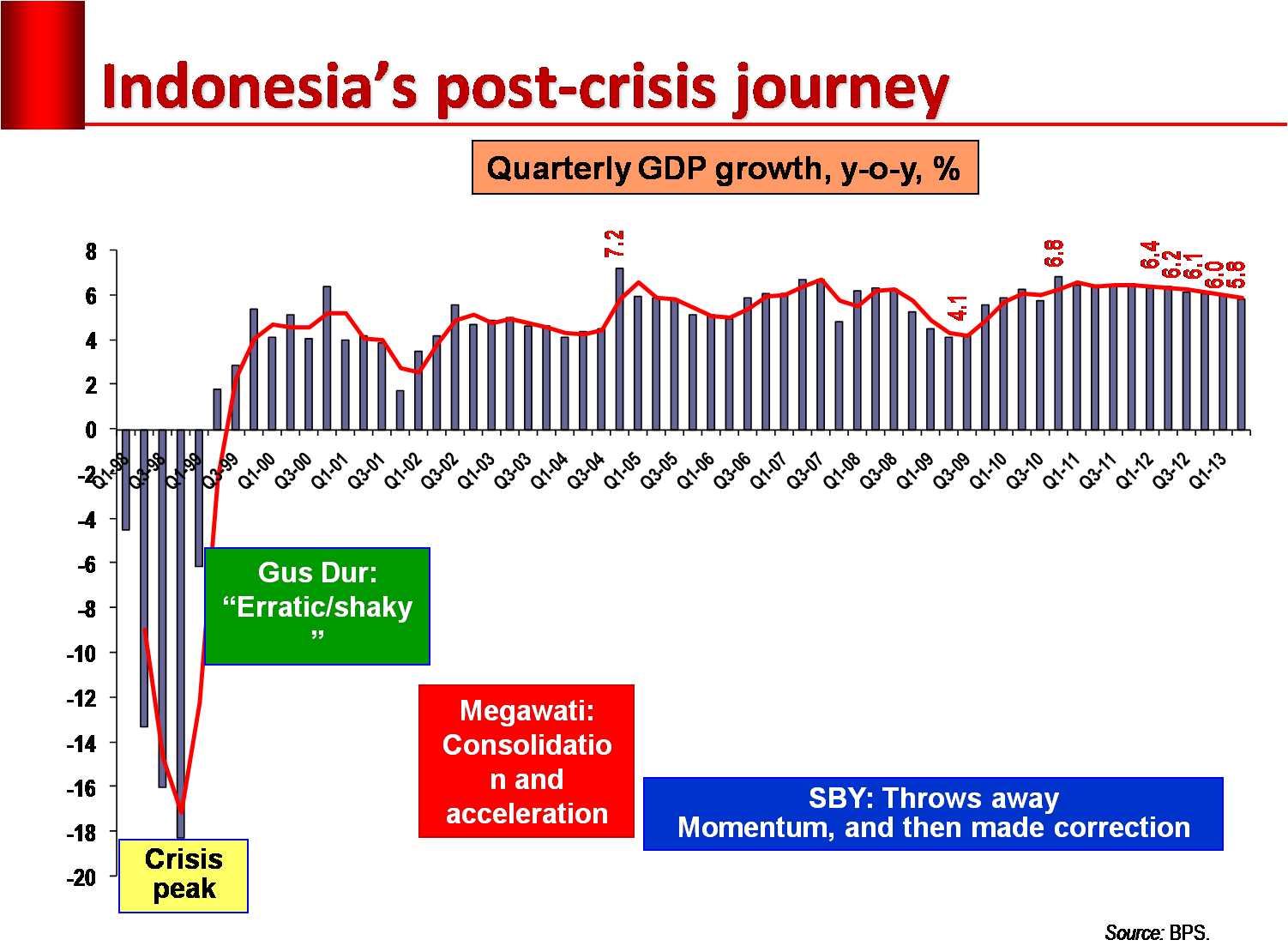 Pertumbuhan ekonomi triwulanan Indonesia melemah untuk keempat kalinya berturut-turut. Bahkan pada triluwan II-2013 sudah berada di bawah 6 persen, persisnya, 5,81 persen. Pertumbuhan di bawah 6 persen pertama kali dalam 10 triwulan terakhir.
