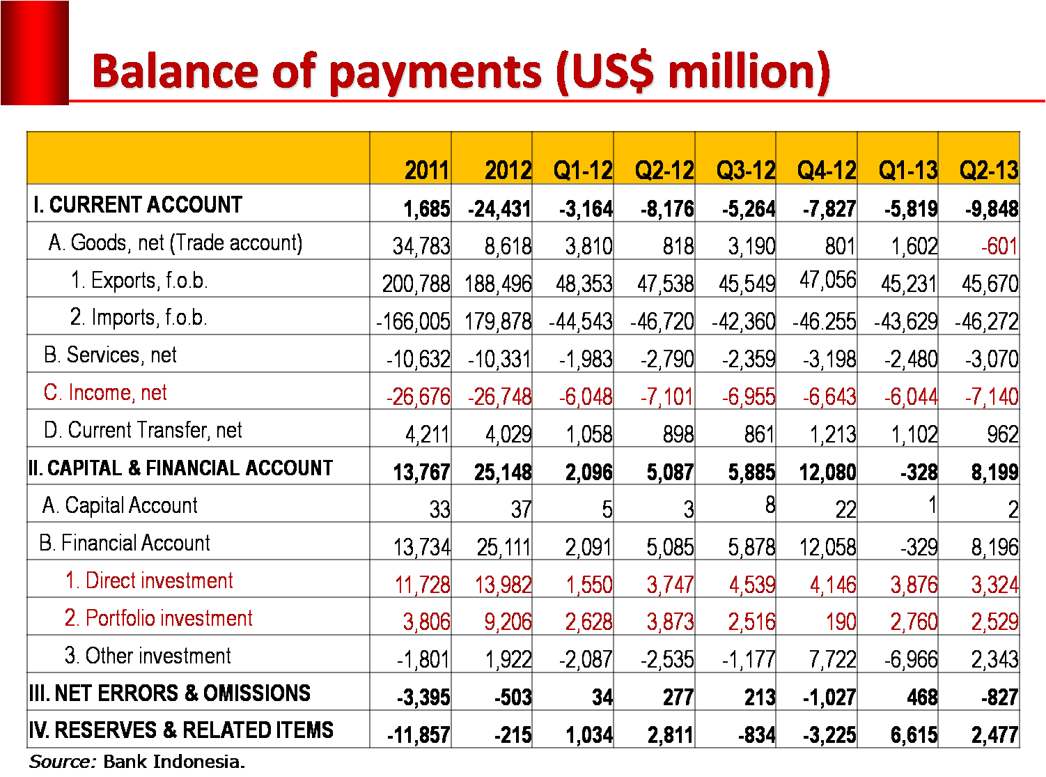 Catatan: Data rinci neraca pembayaran terbaru bisa diunduh di website Bank Indonesia: http://www.bi.go.id/NR/rdonlyres/0AF44705-EA06-42EE-9F2E-3A14AF2E0D0B/29772/LaporanNPITwII2013.pdf.
