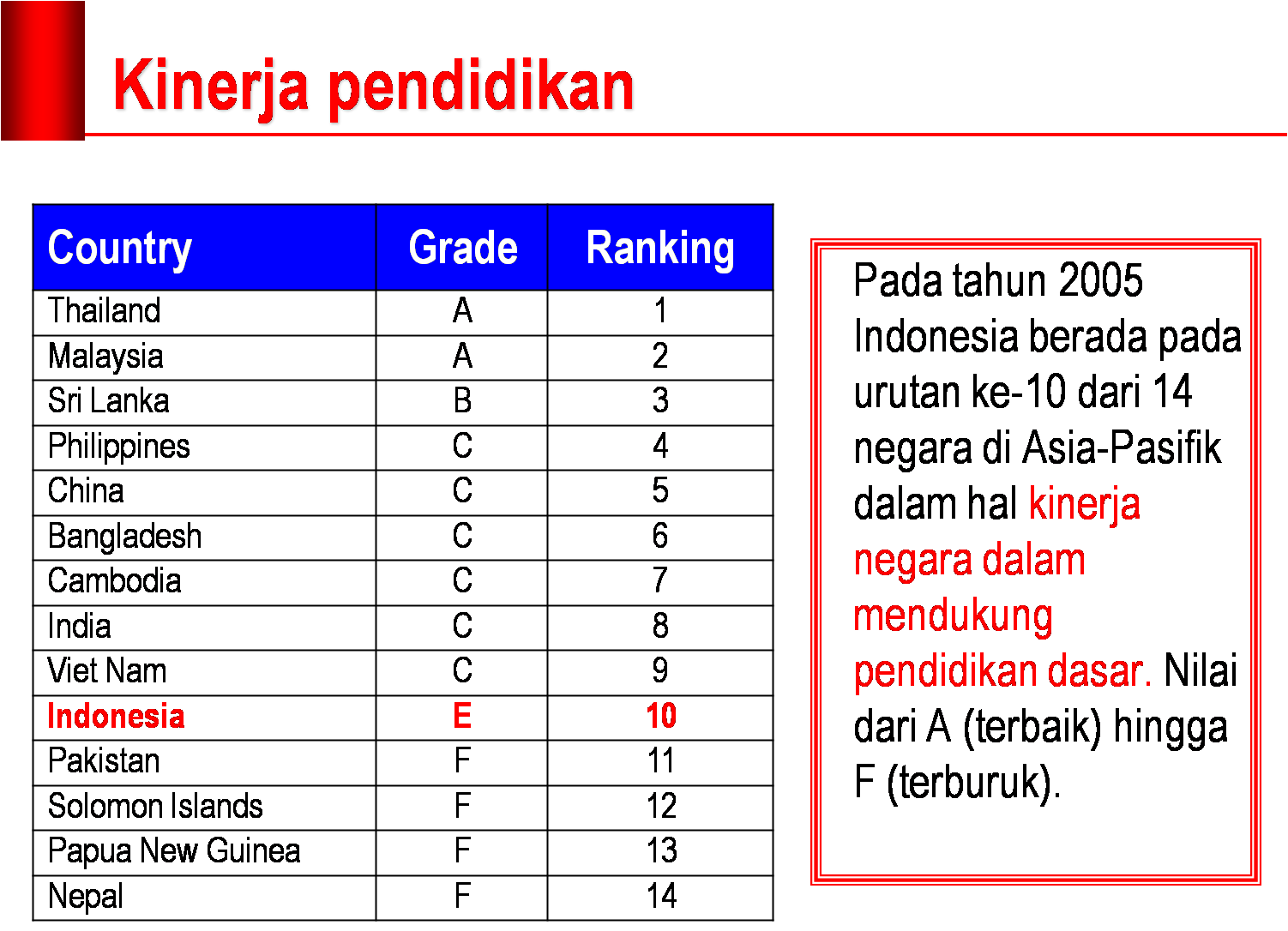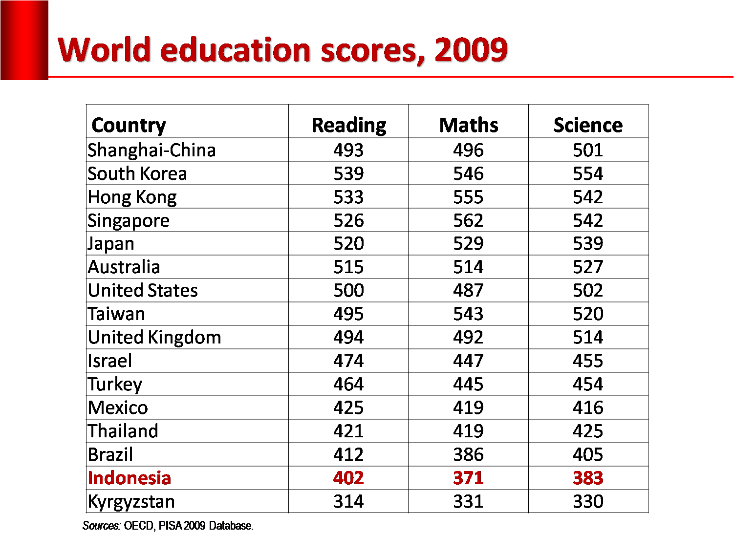 Indonesia sangat tertinggal dalam hal output pendidikan. Dari 65 negara yang disurvei oleh OECD untuk pelajar berusia 15 tahun, Indonesia berada di urutan ke-57. Negara Asean lain yang masuk daftar adalah Singapura di urutan ke-5 dan Thailand di urutan ke-50. Di posisi paling buncit adalah Kyrgyzstan.