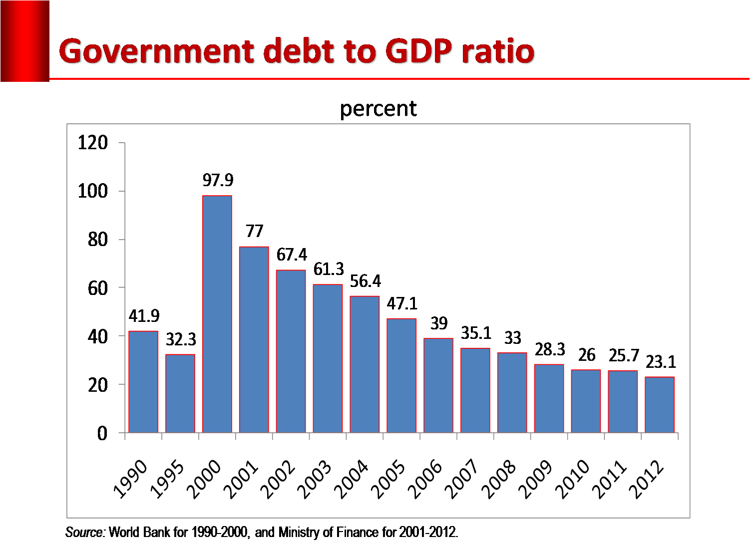 Di sinilah kira melihat ironi. Pemerintah justru tak henti-henti menurunkan nisbah utang terhadap produk domestik bruto (debt to GDP ratio) dan mengklaim pencapaian itu sebagai prestasi membanggakan. Dalam pidato mengantarkan RAPBN 2014 pada 16 Agustus lalu, Presiden menegaskan: “… kita upayakan penurunan rasio utang pemerintah terhadap PDB pada akhir tahun 2014 menjadi sekitar 22-23 persen.” Padahal sejak tahun 2000 nisbah utang pemerintah terhadap PDB telah meluncur turun sangat tajam.
