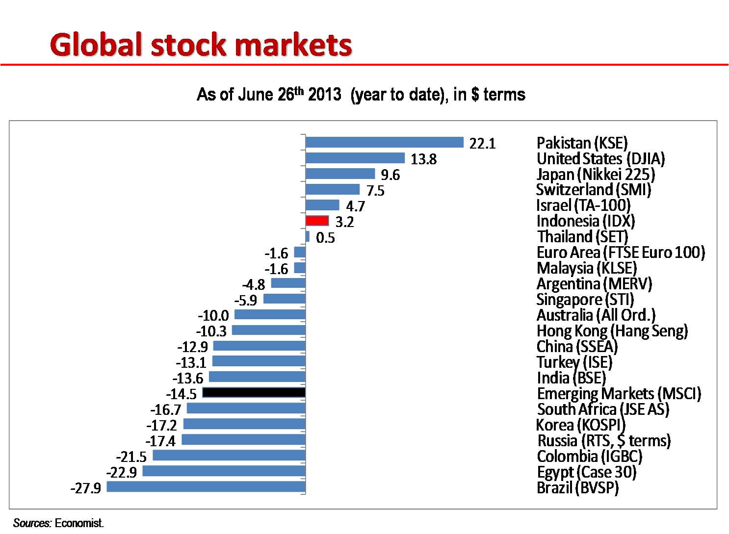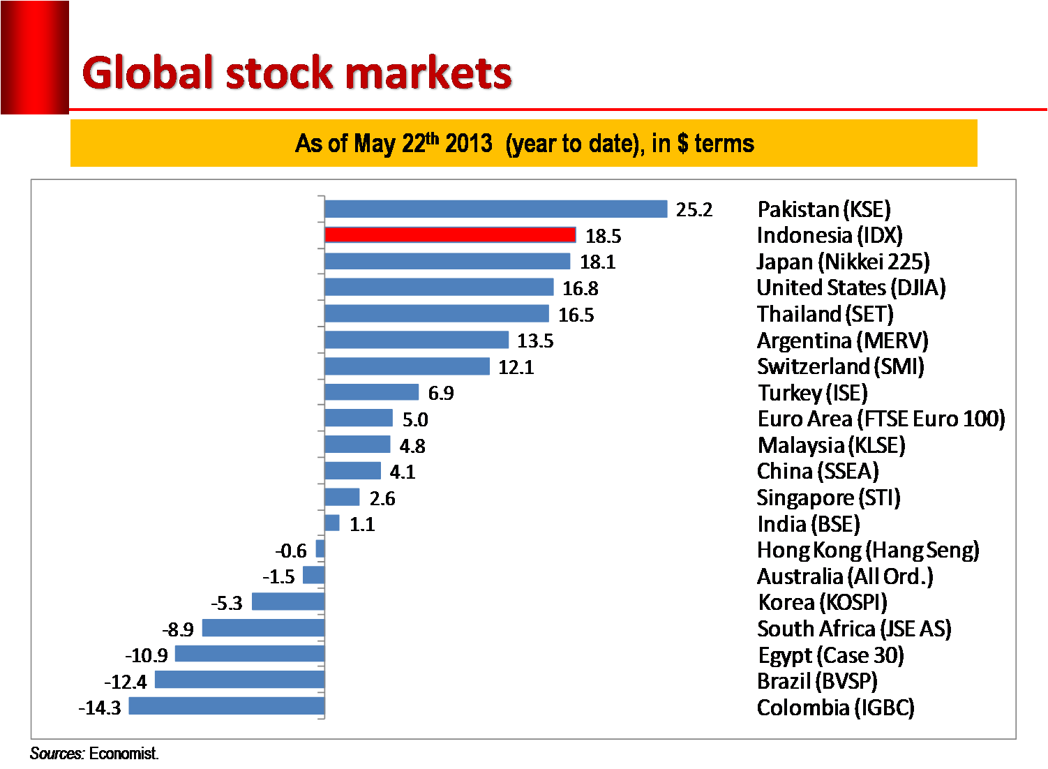 Pada 22 Mei, posisi Indonesia berada di urutan ke-2 setelah Pakistan. Pertumbuhan indeks saham year to date mencapai 18,5 persen. Kinerja saham di negara-negara maju (AS, Jepang, seluruh negara Eropa) berada di bawah Indonesia.