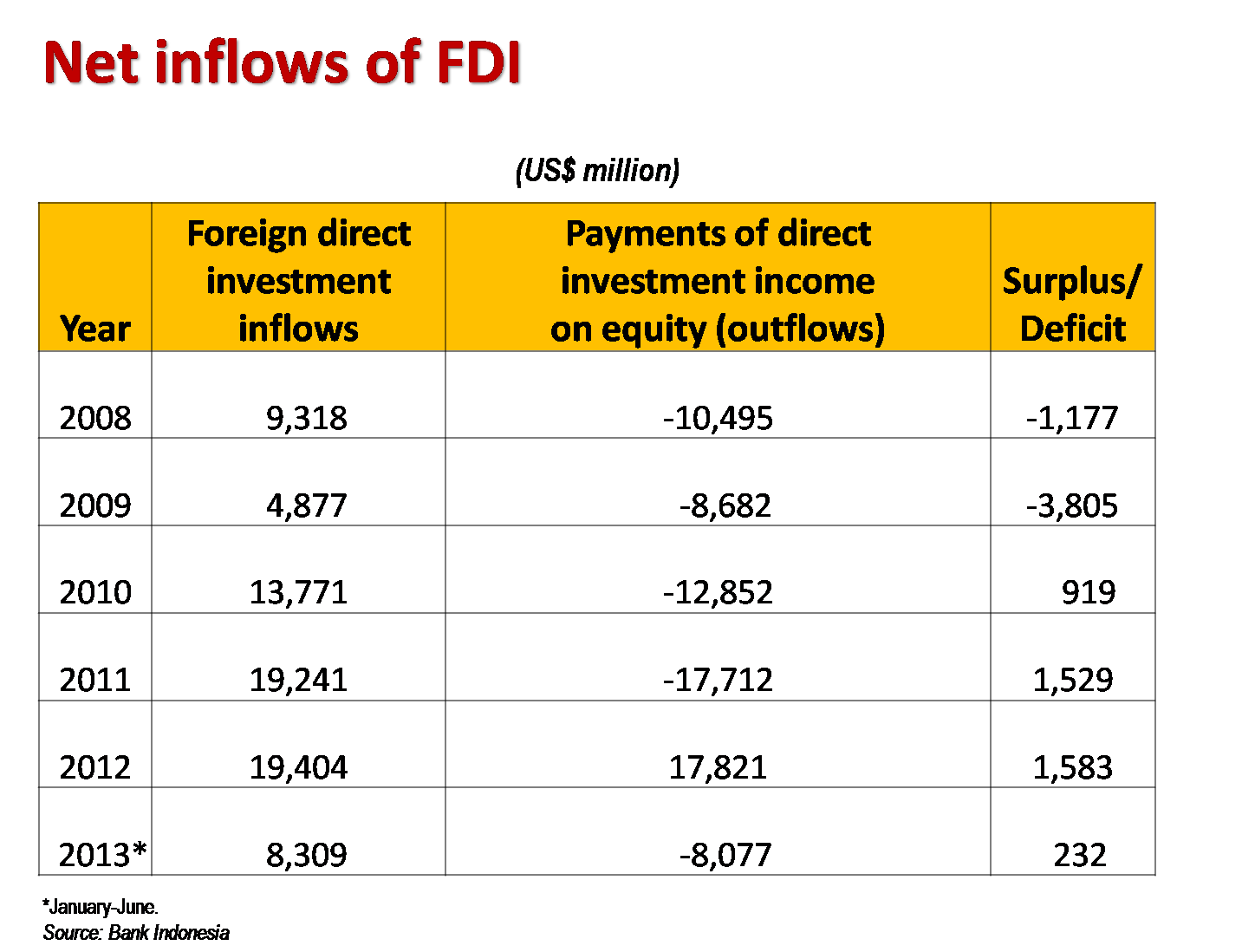 Investasi asing langsung memang masih menunjukkan peningkatan. Sayangnya, nilai repatriasi laba perusahaan-perusahaan asing yang beroperasi di Indonesia juga meningkat pesat, sehingga arus neto investasi asing langsung setelah dikurangi repatriasi laba hanya sekitar 1,5 miliar dollar AS pada tahun 2011 dan 2012, lalu turun drastis hanya 232 juta dollar AS.