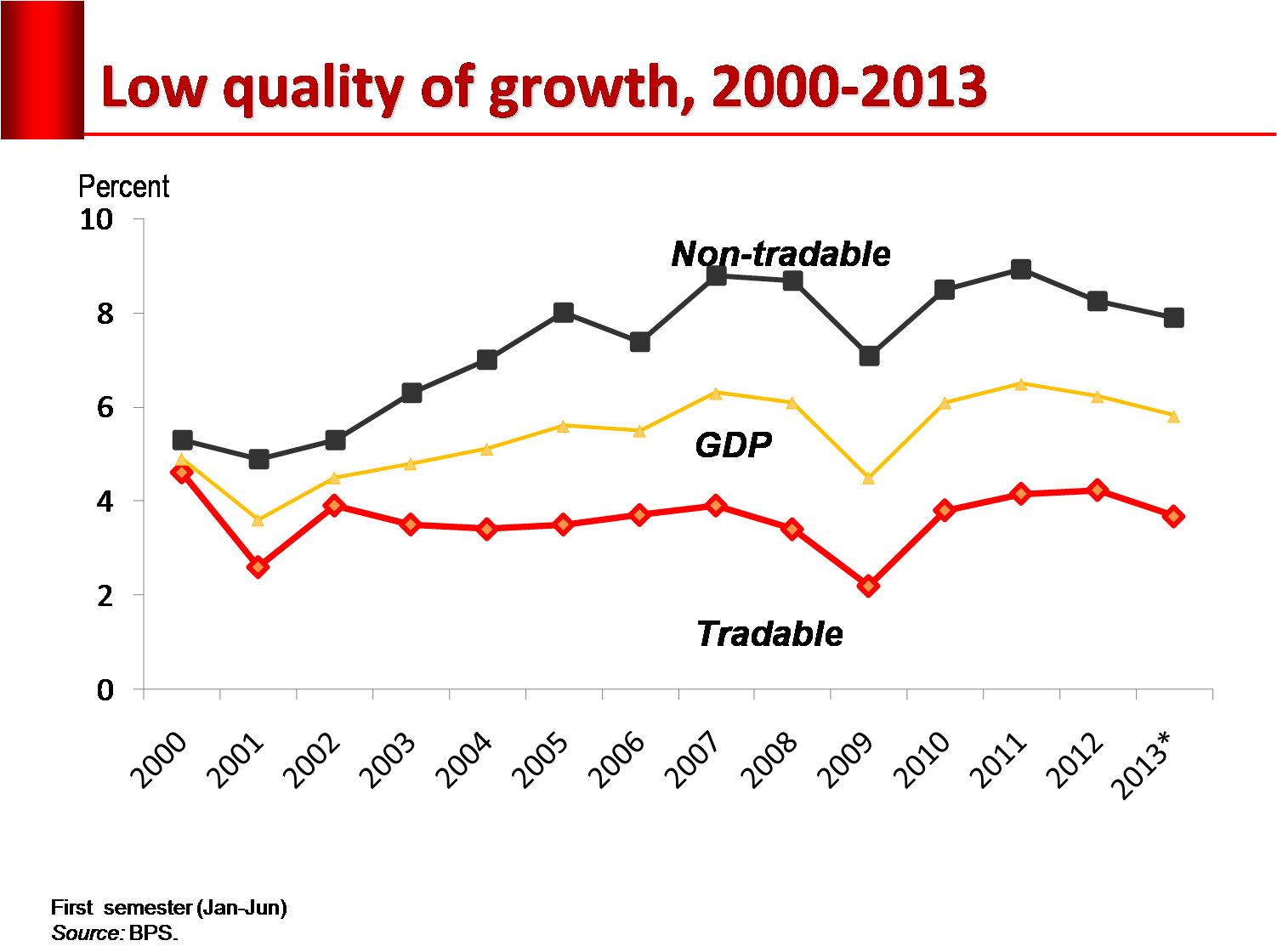 Sejak tahun 2000 pertumbuhan sektor tradable selalu lebih lambat ketimbang sektor non-tradable dengan kecenderungan kesenjangannya semakin menganga.