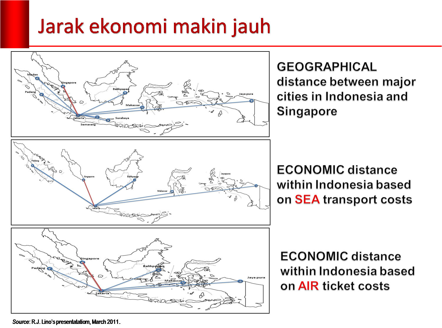 Kenyataan inilah yang membuat jarak ekonomi intra-Indonesia lebih jauh ketimbang jarak geografisnya. Misalnya, jarak ekonomi Jakarta-Padang sekitar dua kali lebih jauh dari jarak ekonomi Jakarta-Singapura.