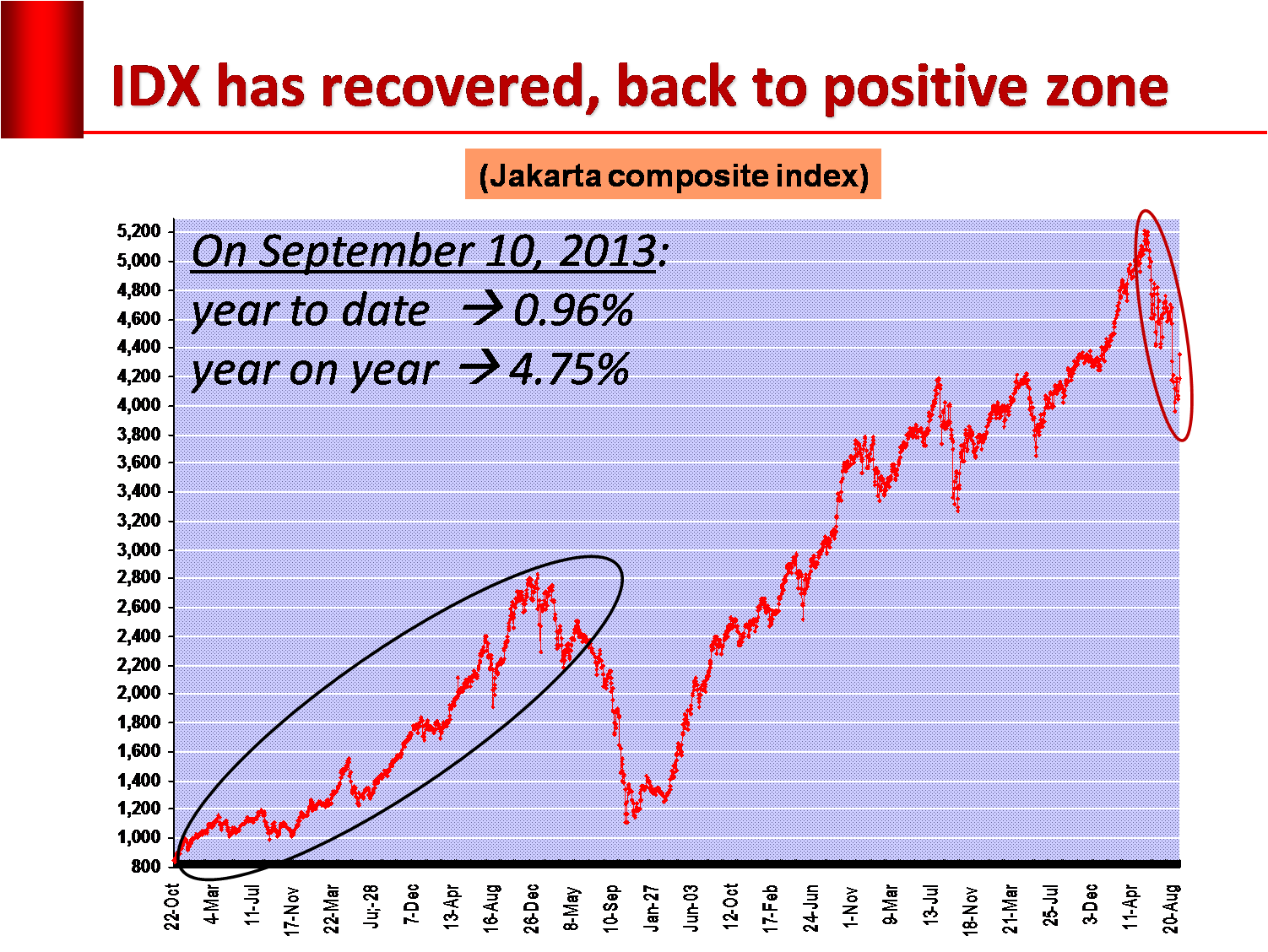 Indeks harga saham Indonesia (IDX) selama tiga hari berturut-turut mengalami kenaikan. Hari ini (10/09) IDX naik tajam sebesar 166,88 poin atau 4 persen ke aras 4.358,143. Kenaikan ini membuat pertumbuhan year to date (ytd) kembali positif, hampir 1 persen. Sedangkan untuk year on year (yoy) lebih tinggi lagi, yaitu 4,75 persen.
