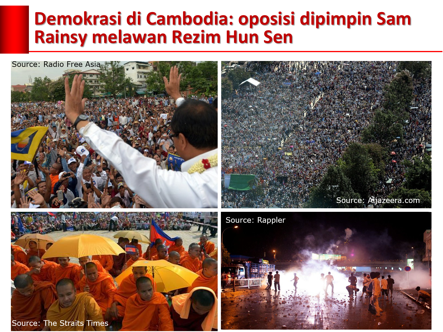 Pemimpin oposisi Kamboja, Sam Rainsy, dan pengikutnya tak menerima hasil pemilu dan masih terus turun ke jalan. Semakin gegap gempita setelah kaum buruh juga ikut berdemonstrasi menuntut kenaikan upah. Mereka mendukung pemimpin oposisi yang menuduh rezim Hun Sen curang dalam pemilu. Pengaduan disampaikan ke Perserikatan Bangsa-Bangsa (PBB).