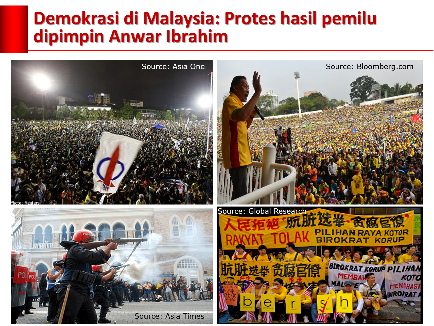 Di Malaysia, walaupun sudah meredup, kelompok oposisi pimpinan Anwar Ibrahim juga menolak hasil pemilu. Perlawanan terbesar sepanjang sejarah demokrasi Malaysia hingga tahun lalu.