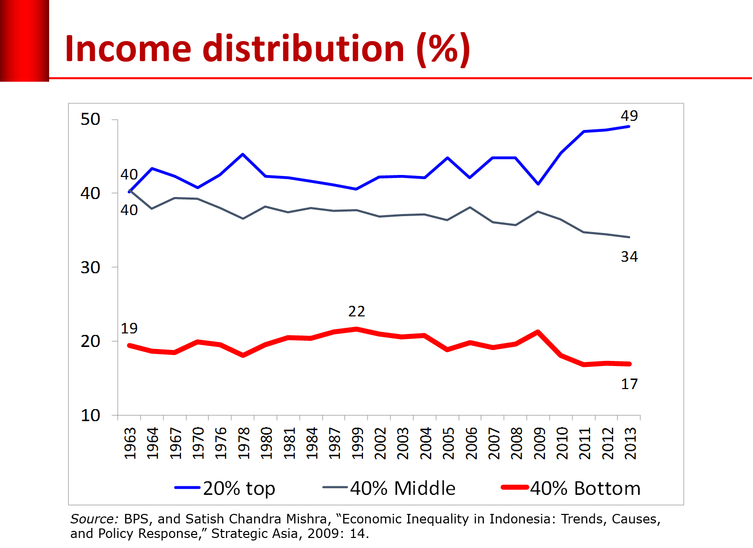 Data distribusi pendapatan memperkuat konstatasi dia atas. Sejak tahun 2010 porsi kelompok 20 persen terkaya naik pesat hingga mencapai 49 persen. Sementara itu, kelompok 40 persen menengah dan 40 persen termiskin terus turun.
