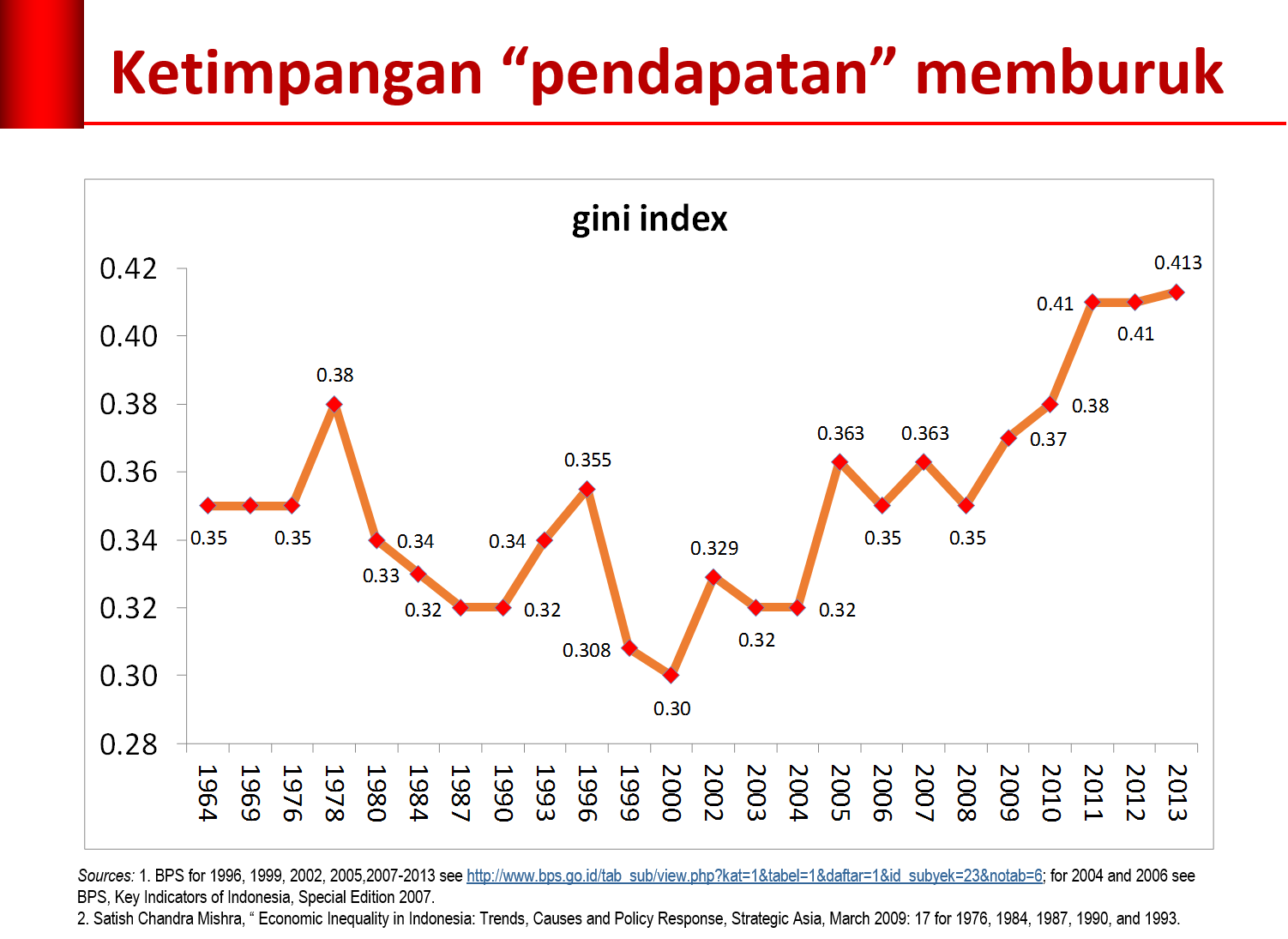 Indeks Gini mengonfirmasikan kecenderungan itu. Selama enam tahun terakhir Indeks Gini mengalami peningkatan dan sejak tahun 2011 menembus angka 0,4. Tahun 2013 meningkat lagi walaupun tipis menjadi 0,413. Kondisi ketimpangan dipandang baik jika Indeks Gini di bawah 0,4, buruk jika di atas 0,5 dan sedang antara 0,4 – 0,5.