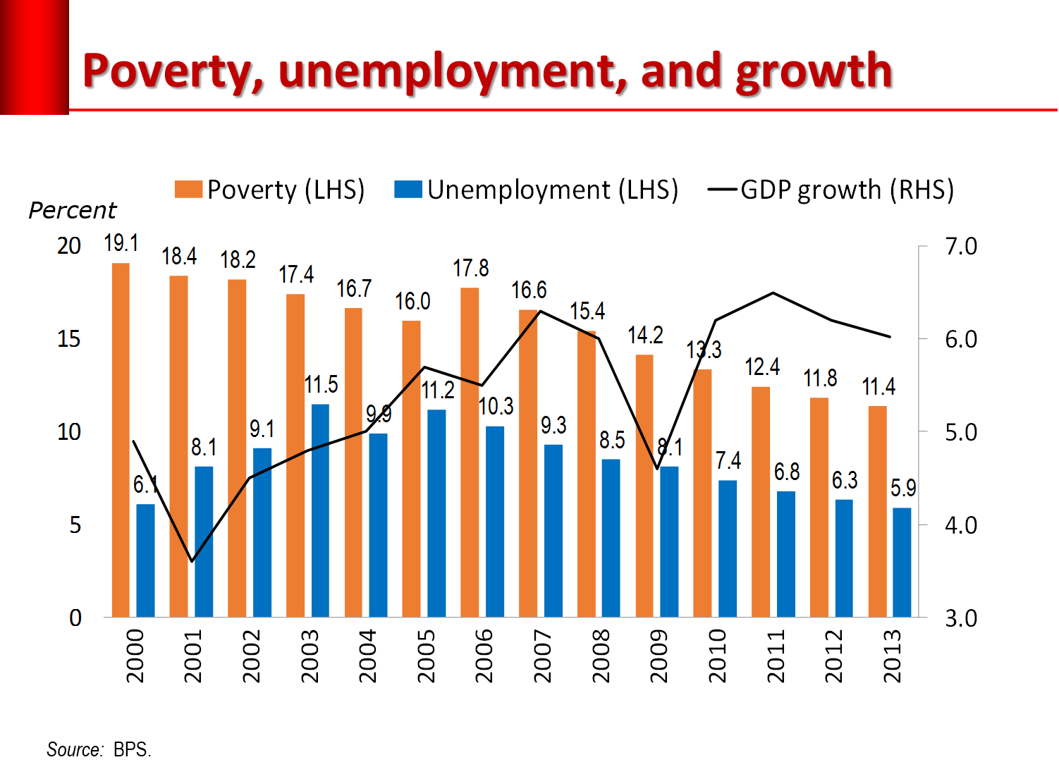 Sejak tahun 2006 jumlah dan persentase penduduk miskin mengalami penurunan secara konsisten, walaupun kecepatan penurunannya melambat, juga apabila dibandingkan dengan negara-negara tetangga. Penurunan jumlah orang miskin sejalan dengan tambahan penciptaan lapangan kerja sehingga menurunkan tingkat pengangguran. Ada yang agak mengganggu pada peraga di atas. Pada kurun waktu 2001-2005 tingkat pengangguran naik justru ketika pertumbuhan ekonomi meningkat. Sebaliknya, pada periode 2007-2009 dan 2011-2013, tingkat pengangguran justru terus turun padahal pertumbuhan ekonomi melambat. Bahkan, pada tahun 2009 ketika krisis keuangan global membuat pertumbuhan ekonomi Indonesia merosot cukup tajam, tingkat pengangguran tetap turun lumayan. Hal ini bias terjadi karena banyak pekerja di Indonesia terlalu miskin untuk menganggur (too poor to be unemployed). Kalau terkena pemutusan hubungan kerja (PHK) hari ini, keesokan harinya harus mendapatkan pekerjaan baru, apa pun pekerjaan itu: entah memulung, mengojek, mengobyek, menjadi joki 3 in 1, dan sebagainya. Jadi, rendahnya tingkat pengangguran tidak mencerminkan kualitas kerja, tingkat kesejahteraan, atau kualitas pertumbuhan.
