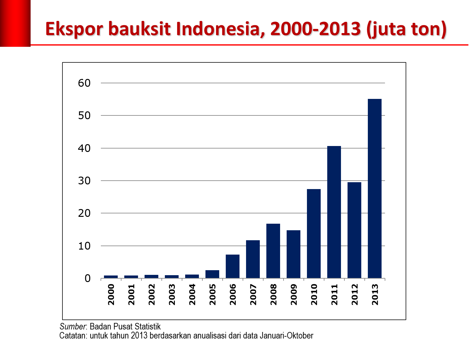 Pengurasan kekayaan alam dengan intensitas luar biasa terjadi dalam sepuluh tahun terakhir. Bauksit sebagai contoh. Karena Indonesia tidak memiliki fasilitas pengolahan bauksit sama sekali, maka seluruh produksi bauksit diekspor. Pada tahun 2004 ekspor bauksit masih 1 juta ton. Hanya membutuhkan waktu enam tahun ekspor bauksit meningkat 27 kali lipat menjadi 27 juta ton. Setahun kemudian melonjak lagi menjadi 40 juta ton. Tahun 2013 ekspor bauksit diperkirakan sudah menembus 50 juta ton, mengingat realisasi ekspor Januari-Oktober sudah mencapai 46 juta ton.