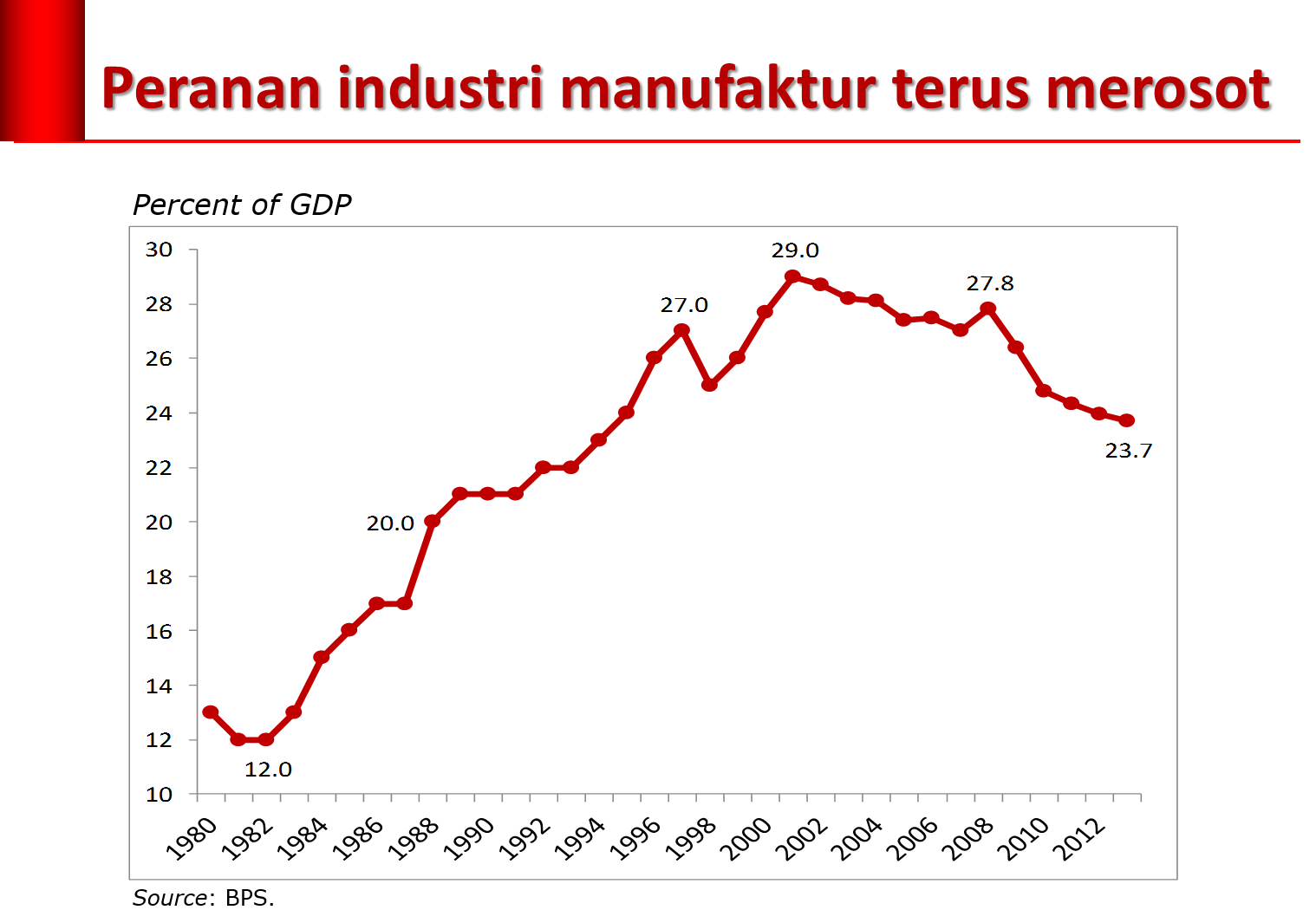 Indonesia baru menapaki porsi manufaktur dalam PDB tertinggi sebesar 29 persen pada tahun 2001. Setelah itu selama empat tahun berturut-turut turun. Naik sedikit pada tahun 2006, tetapi setahun kemudian turun lagi. Penurunan juga terjadi pada tahun 2007 menjadi 27 persen, lalu setahun kemudian naik menjadi 27,8 persen. Setelah itu terus menerus turun hingga mencapai titik terendah sebesar 23,7 persen tahun 2013.