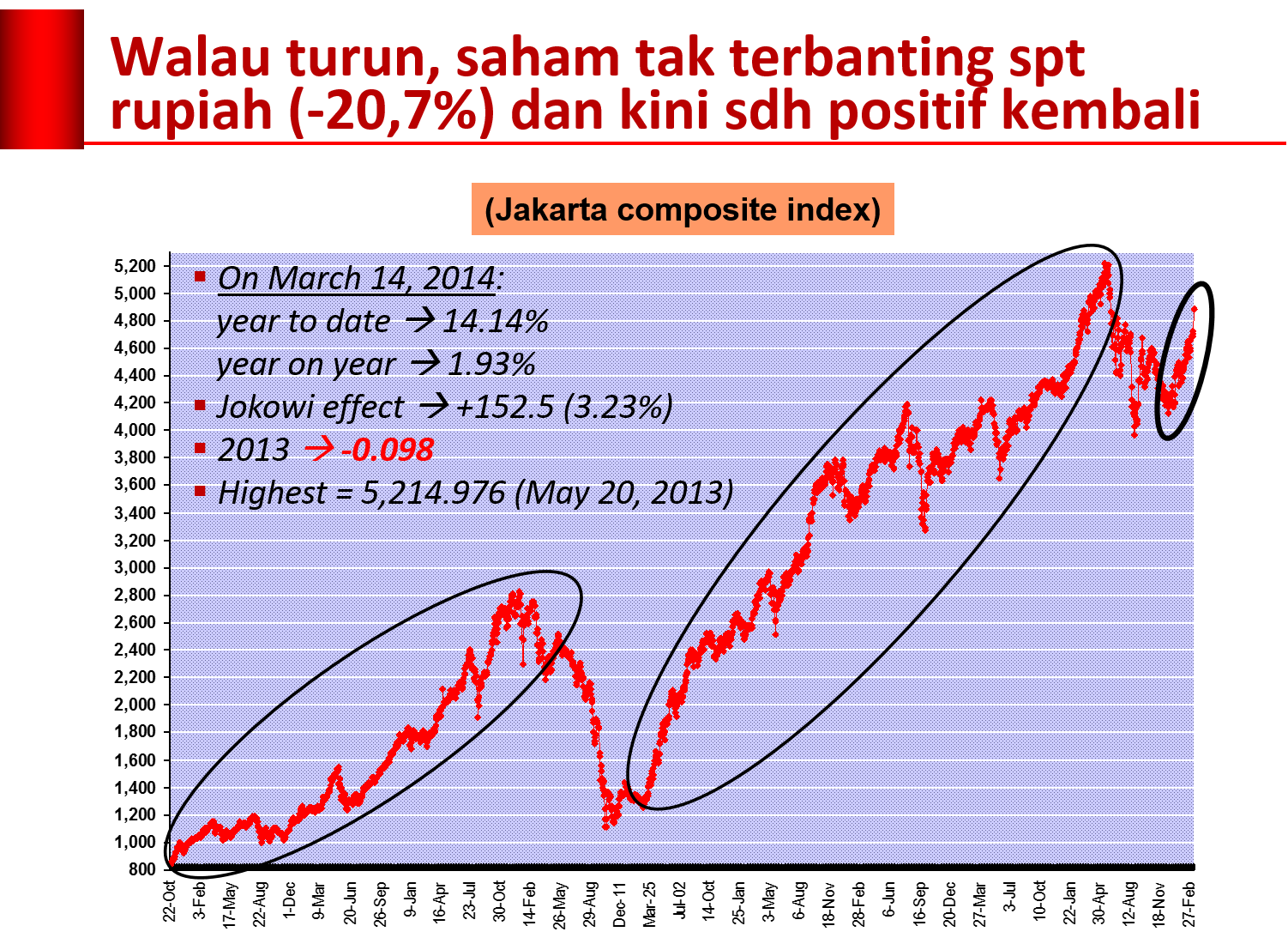 Indeks saham Indonesia diperkirakan segera menembus 5.000. Pada penutupan transaksi bursa Jumat (14/3), indeks melesat 152,5 poin atau naik 3,23 persen. Tampaknya Jokowi effect sudah mulai berlangsung.