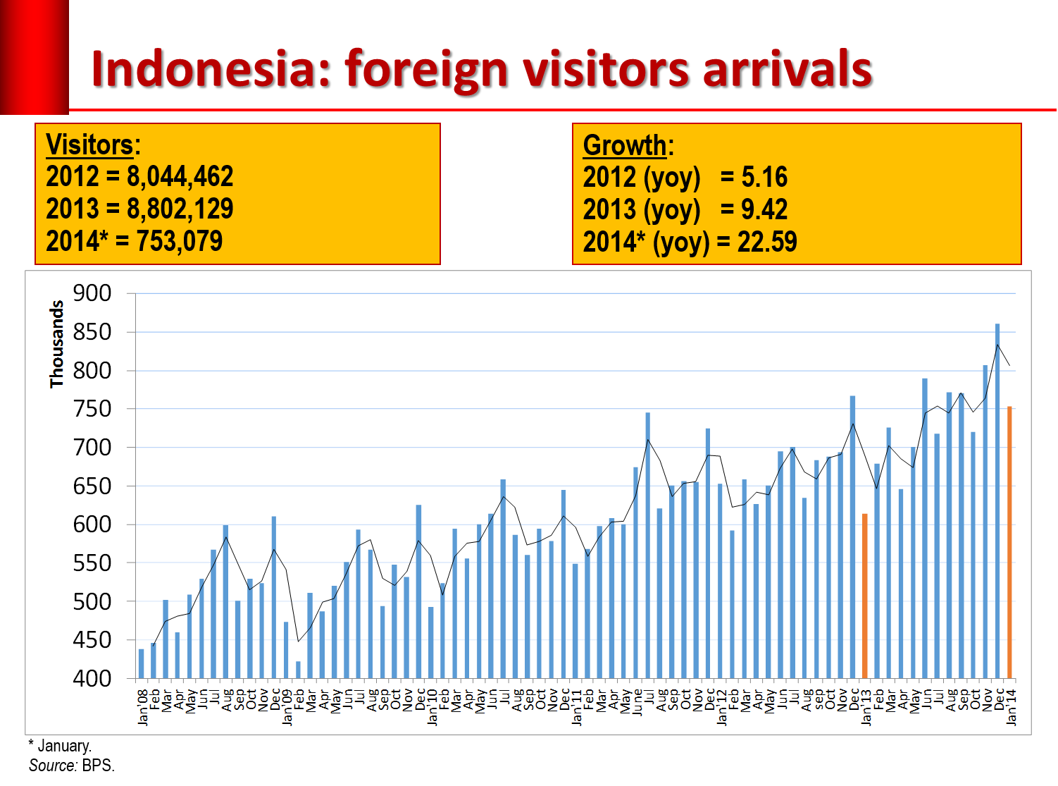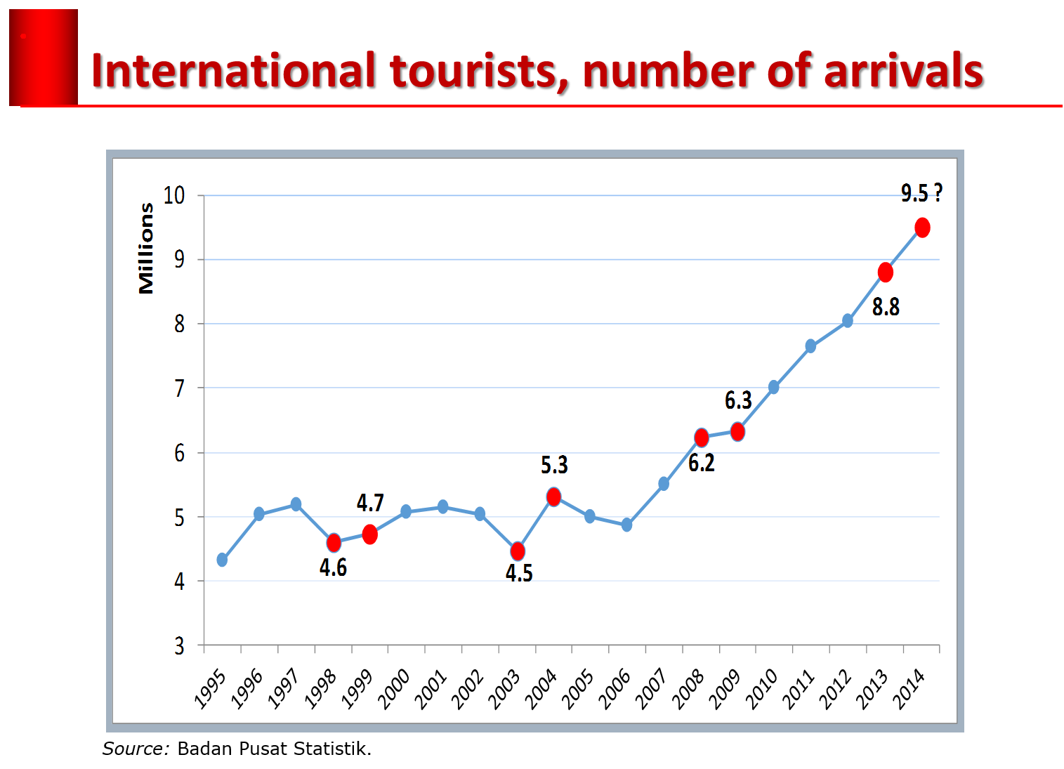 Walaupun tahun pemilu, jumlah turis asing sangat boleh jadi tetap meningkat, bahkan berpeluang meningkat lebih lebh tinggi dibandingkan tahun 2013, bisa dua digit. Selama tiga pemilu pasca reformasi, jumlah turis pada tahun pemilu selalu lebih tinggi ketimbang tahun sebelumnya. Perkiraan konservatif saya, jumlah turis asing tahun ini sekitar 9,5 juta, naik dari 8,8 juta tahun 20133. Kalau menggunakan perkiraan optimistik, jumlah turis tahun ini bisa mencapai 9,8 juta. Angka itu sebetulnya sangat rendah dibandingkan jumlah turis ke Malaysia, Thailand, dan Singapura.
