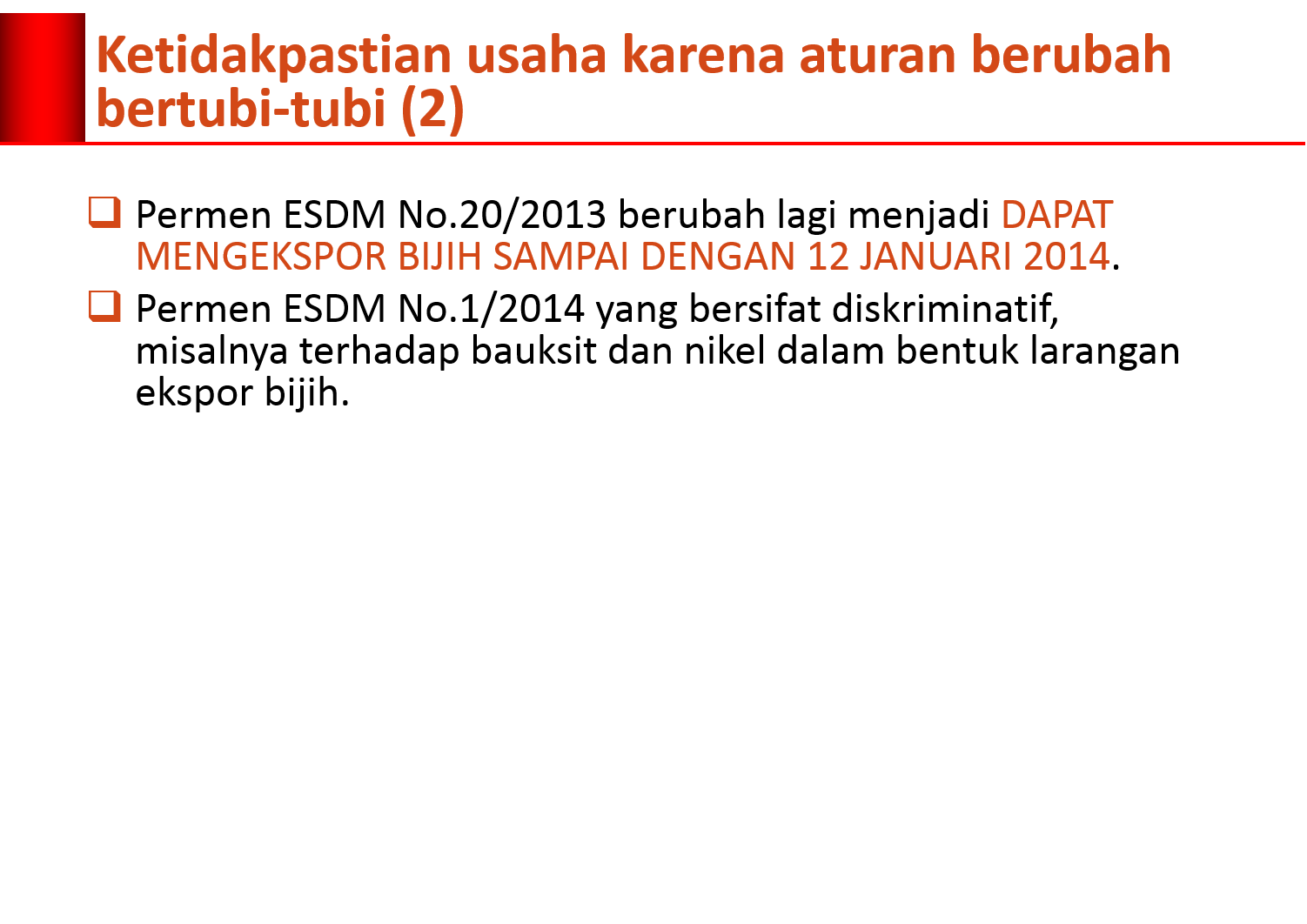 Judicial review ke mahkamah Agung telah dikabulkan, tetapi pemerintah tetap saja melaksanakan keputusannya melarang ekspor produk mineral tertentu. Oleh karena itu, pemohon mengajukan judicial review ke MK.