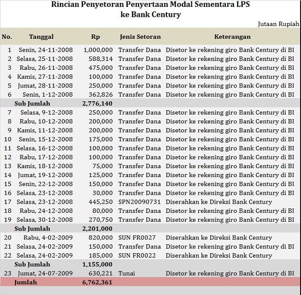 Data berikut menunjukkan beberapa setoran dilakukan dalam bentuk SPN dan SUN. Ada juga setoran tunai sekali yang disetor ke rekening giro Bank Century di BI.
