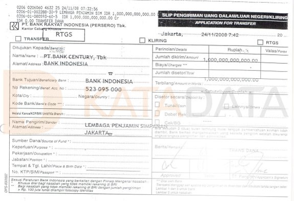 Tak pula ada keraguan bahwa dana yang dikucurkan oleh LPS ke Bank Century dilakukan lewat mekanisme transfer (bukan tunai berupa uang dalam bentuk fisik). Tranfer pertama dilakukan hari Senin, 24 November 2008, pk. 07:42. Atas fakta ini, ada yang meragukan mengapa dilakukan sedemikian pagi. Bukankah bank belum buka? Bank memang belum buka untuk pelayanan publik, tapi karyawan sudah mulai bekerja. Ada pun layanan RTGS (window time RTGS) berlangsung dari pk. 06:30-16:30.
