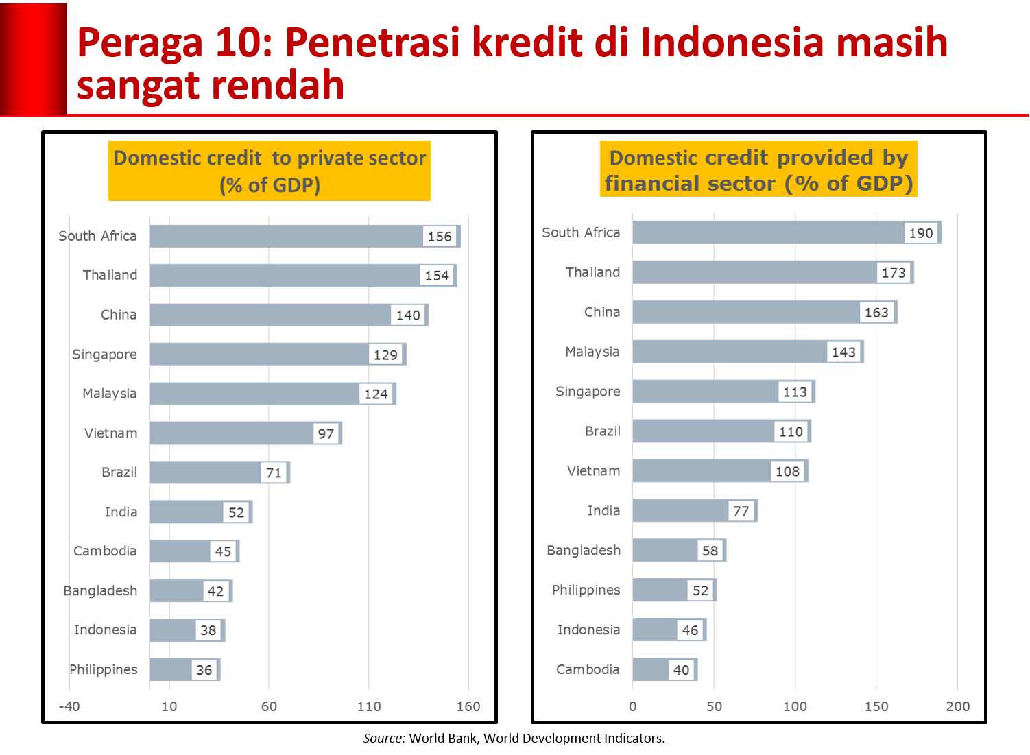 Walaupun tekanan eksternal tidak separah seperti yang dialami beberapa negara emerging markets, perekonomian Indonesia masih dihadapkan pada beberapa kendala struktural. Salah satu yang terpenting adalah masih dangkalnya sektor finansial seperti tercermin dari financial development index.[3]