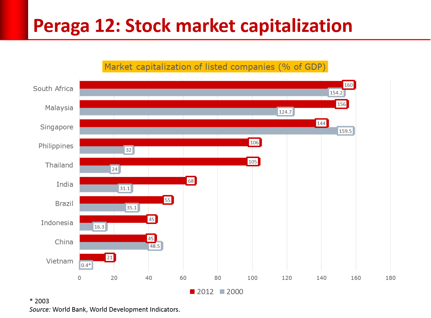 Sekalipun pasar saham tumbuh pesat dalam lima tahun terakhir, namun nilai kapitalisasi pasarnya juga tergolong rendah dibandingkan dengan Asean-5 (Singapura, Malaysia, Thailand, dan Filipina). Lihat Peraga 12.