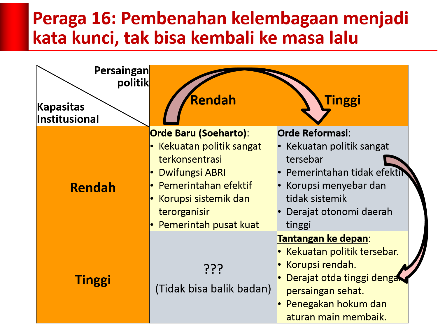 Yang tak kalah penting adalah pembenahan kelembagaan, yakni bagaimana secara efektif mentransformasikan extractive political and economic institutions menjadi inclusive political and economic institutions. Hanya dengan begitu pembangunan ekonomi yang berkelanjutan dan berkeadilan bisa terwujud. Lihat Peraga 16.