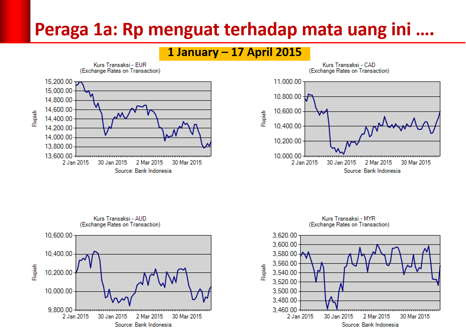 Sejak awal Januari 2015, tidak hanya rupiah yang mengalami pelemahan, melainkan hampir semua mata uang dunia. Tercatat setidaknya rupiah menguat terhadap Euro, dollar kanada dollar Austrlia, dan ringgit Malaysia. Lihat Peraga 1a.