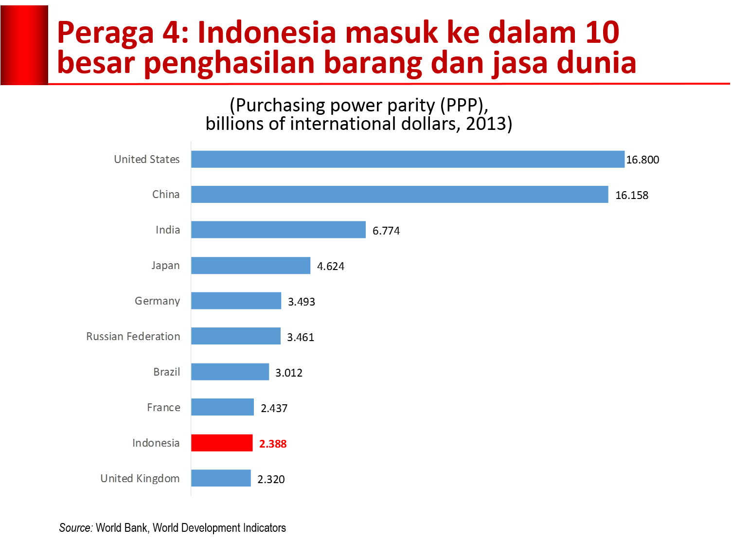 Berdasarkan PDB menurut paritas daya beli (Gross Domestic Product/GDP based on purchasing power parity/PPP) tahun 2013 versi Bank Dunia, empat negara Asia bertengger di jajaran sepuluh besar dunia, masing-masing China di posisi ke-2, India dan Jepang di posisi ke-3 dan ke-4, serta Indonesia di urutan ke-9. Benua Amerika hanya diwakili oleh dua negara yaitu Amerika Serikat di posisi puncak dan Brazil ke-7. Sisanya adalah empat negara Eropa, yaitu Jerman (ke-5), Rusia (ke-6), serta Prancis (ke-8) dan Inggris (ke-10). Pada tahun 2014, China menyusul Amerika Serikat sehingga berada di posisi puncak, sedangkan Indonesia naik satu peringkat (ke-8) menyusul Prancis. Lihat Peraga 4.