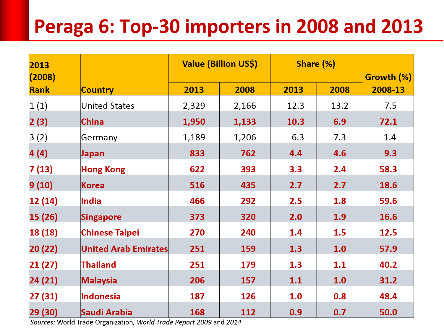 Pertumbuhan ekonomi yang tinggi, bahkan tertinggi di dunia serta keterbukaan kebanyakan negara Asia membuat impor mereka pun naik pesat. Semua kawasan di dunia semakin membidik pasar Asia yang menjanjikan. Impor Asia meningkat dari 26,4 persen pada tahun 2008 menjadi 32,2 persen pada tahun 2013. Lihat Peraga 6.