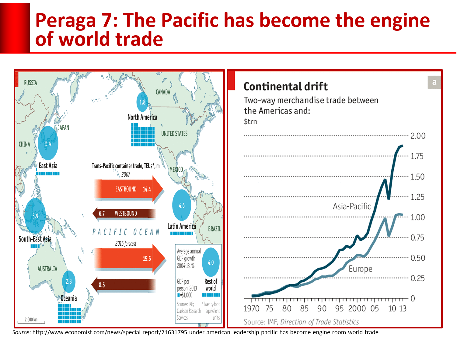 Tak heran jika Asia-Pasifik menjadi mesin utama perdagangan dunia. Perdagangan Trans-Pasifik tumbuh pesat mengalahkan perdagangan Trans-Atlantik. Hal ini antara lain terlihat dari nilai perdagangan antara Amerika Serikat dengan Asia-Pasifik yang sejak tahun 1980-an telah melampaui perdagangan Amerika Serikat dengan Eropa. Lihat Peraga 7. Tidak berlebihan muncul julukan abad ini merupakan “Abad Asia”.