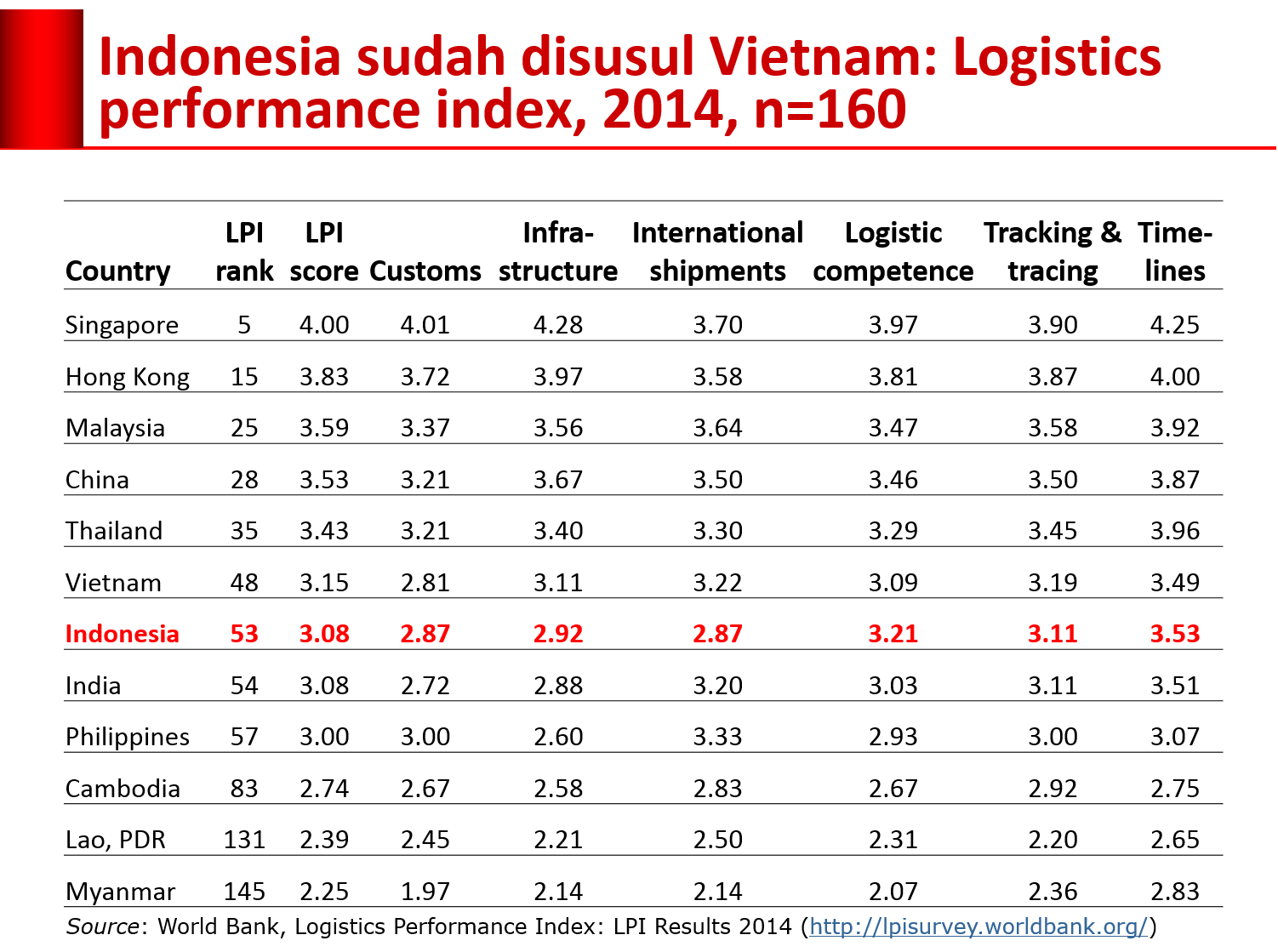Ukuran lain yang lazim dipakai untuk membandingkan perbandingan kinerja logistik antarnegara adalah Logistics Performance Index (LPI). Walaupun telah menunjukkan perbaikan dalam skor dan ranking sejak 2012, tetap saja Indonesia tidak bisa mengejar ketertinggalannya dari negara-negara di atas. Bahkan Indonesia telah disusul oleh Vietnam.