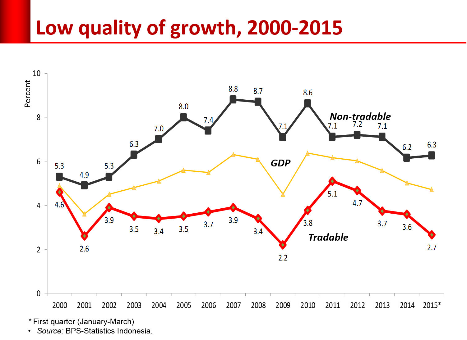 Ada yang ganjil jika kita menelaah lebih jauh kinerja perekonomian pada triwulan I-2015. Biasanya pertumbuhan sektor penghasil barang (tradable sector) dan sektor jasa (non-tradable sector) bergerak dengan arah bersamaan, sama-sama naik atau sama-sama turun. Namun, pada triwulan I-2015, sektor tradable merosot cukup tajam, sedangkan sektor non-tradable tetap naik. Bisa dikatakan penurunan pertumbuhan ekonomi disertai oleh kemerosotan kualitas pertumbuhan. Sektor jasa yang pertumbuhannya naik sangat sedikit menyerap tenaga kerja, khususnya tenaga kerja formal. Tak heran jika angka pengangguran pun meningkat pada Februari 2015 (5,81 persen) dibandingkan dengan Februari 2014 (5,70 persen).