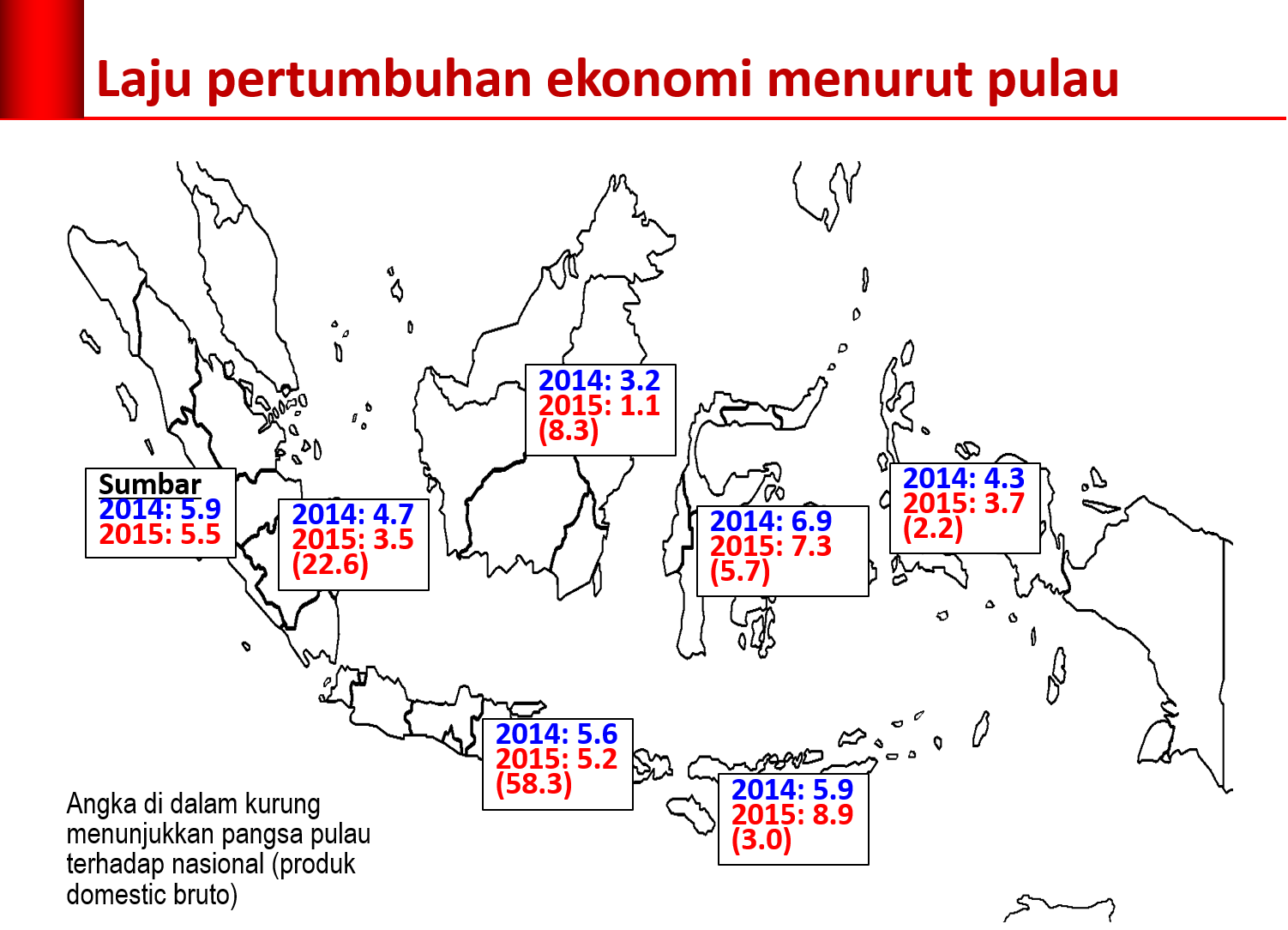 Terburuk kedua adalah Sumatera. Pada triwulan I-2015 Sumatera hanya tumbuh 3,5 persen, turun 120 basis poin dibandingkan tahun 2014 yang tumbuh 4,7. Maluku dan Papua di urutan ketiga terburuk dengan pertumbuhan 3,7 persen pada triwulan I-2015, turun sebesar 60 basis poin dari tahun 2014 sebesar 4,3 persen.