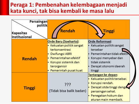 Kapasitas institusional juga rendah sehingga menimbulkan potensi besar persoalan governance. Tidak heran jika korupsi mendarah daging di elit kekuasaan. Korupsinya terpusat, terorganisir, dan sistemik. Pemerintahan berjalan efektif, dalam artian apa saja yang telah digariskan penguasa tertinggi terlaksana dengan mulus. Tetapi, efektif belum tentu benar. Apalagi tidak ada mekanisme checks and balances yang memadai. Sekali salah langkah bisa kebablasan, yang muaranya menjelma menjadi krisis sebagaimana terjadi tahun 1998. Sementara itu, Pemerintah pusat sangat dominan. Segalanya serba sentralistik. Lihat Peraga 1.