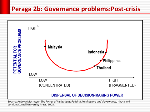 Korupsi kian tersebar, tidak lagi terbatas di pusat kekuasaan, karena governance problems tetap tinggi. Jadi, persoalan tata kelola (governance) senantiasa menggelayuti kehidupan berbangsa dan bernegara, nuansanya saja yang berbeda. Peraga 2a menunjukkan posisi Indonesia sebelum krisis tahun 1998 berada di kiri atas: dispersi kekuatan pengambilan keputusan rendah (terkonsentrasi) sehingga berpotensi mengalami persoalan governance tinggi. Posisi Indonesia lebih tinggi dari Malaysia. Tengok lompatan setelah krisis pada Peraga 2b. Posisi Indonesia berpindah ke ektrem lain: dispersi kekuatan pengambilan keputusan tinggi (terfragmentasi), lebih tinggi dari Filipina dan Thailand. Walhasil, potensi munculnya persoalan governance tetap tinggi.