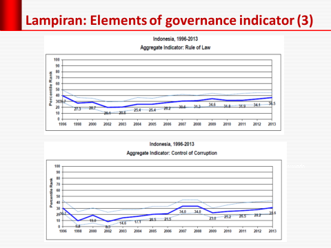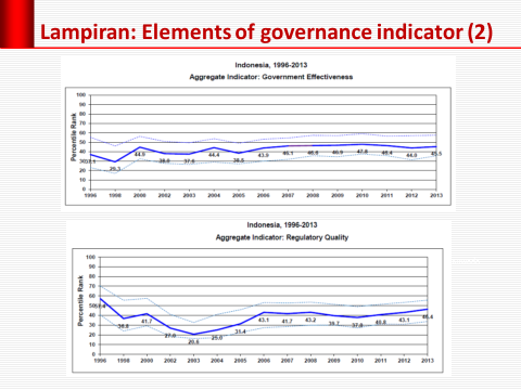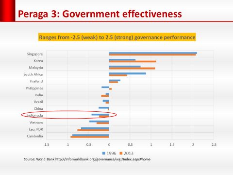 Pemerintahan menjadi kurang efektif. Walaupun indeks keefektifan pemerintah (government effectiveness) menunjukkan sedikit perbaikan, namun tandanya masih negatif. Sebelum reformasi dan setelah reformasi, indeks untuk Indonesia tetap saja negatif. Indonesia hanya lebih baik dibandingkan dengan negara-negara Indochina (Vietnam, Laos, dan Kamboja). Negara-negara ASEAN lainnya berada di zona positif (Lihat Peraga 3). , Indeks keefektifan pemerintah untuk Indonesia selama kurun waktu 1996-2013 selalu negative (lihat Peraga 4).