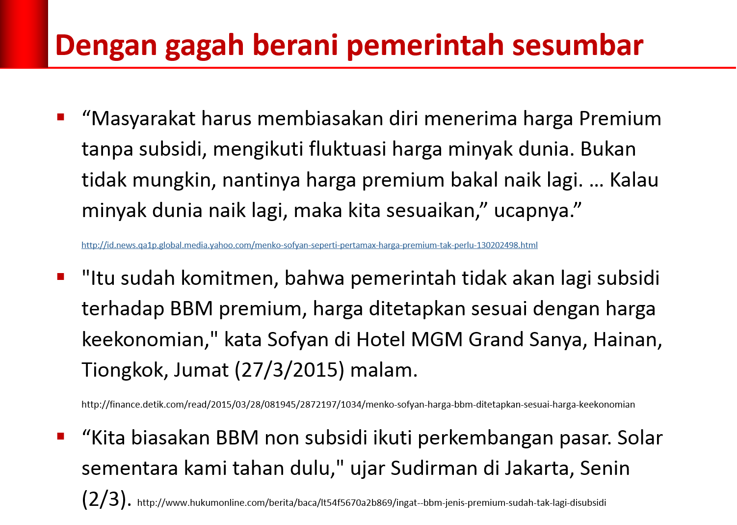 Konteks heboh soal Jokowi lebih neolib dari SBY adalah ketika saya menjelaskan slide kedua terakhir. Di slide itu terpampang ucapan dua menteri tentang mekanisme baru penetapan harga BBM.