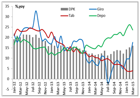 Tengok saja pertumbuhan dana masyarakat (dana pihak ketiga/DPK) di perbankan pada triwulan I-2015 yang masih naik cukup tajam sebesar 16 persen dibandingkan dengan triwulan sebelumnya sebesar 12,3 persen. Pada April 2015 pertumbuhan DPK sedikit turun menjadi 14,2 persen.
