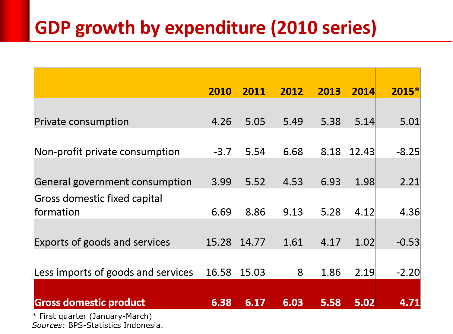 Yang pasti, belanja pemerintahlah yang pertumbuhannya merosot tajam. Dan itu sudah terjadi sejak 2014 yang mana pertumbuhan konsumsi pemerintah hanya 1,98 persen. Pada triwulan I-2015 masih tetap rendah sebesar 2,21 persen. Jadi, yang bikin lesu adalah pemerintah sendiri.