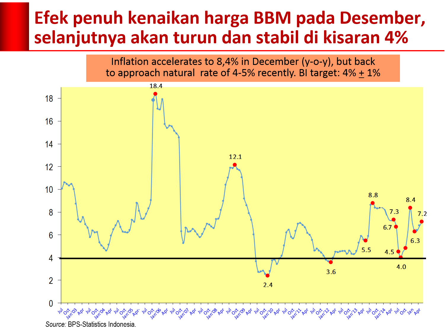 Di pihak lain, laju inflasi censerung turun setelah mencapai titik tertinggi pada bulan Desember 2014 akibat kenaikan tajam harga bahan bakar minyak (BBM) pada pertengahan November 2014.