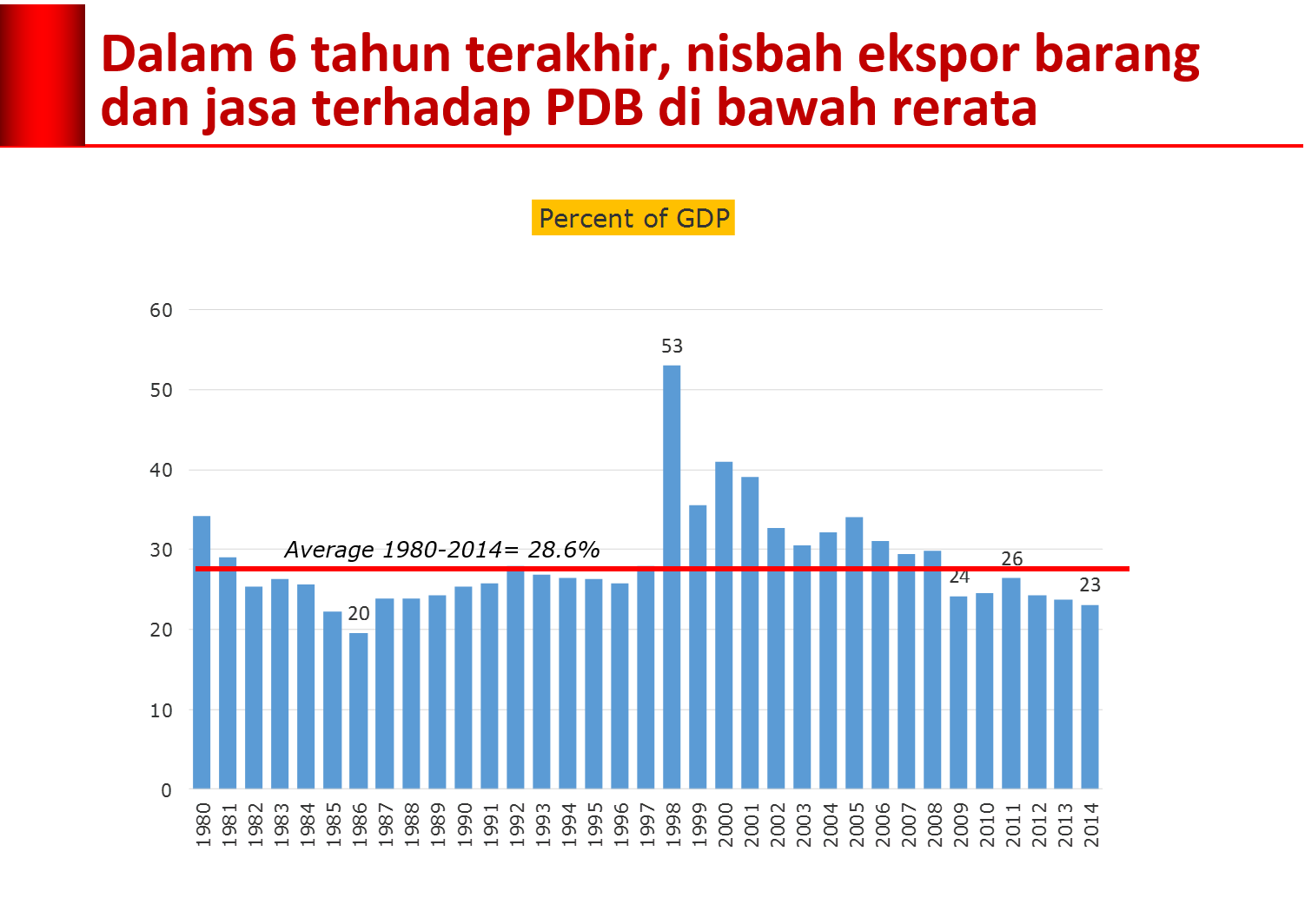 Peraga di bawah menunjukkan rata-rata pangsa ekspor barang dan jasa dalam PDB relative stabil. Selama kurun waktu yang cukup panjang (1980-2014) peranan ekspor dalam PDB sebesar 28,6 persen. Dalam enam tahun terakhir justru terjadi penurunan. Kalaupun naik, sulit membayangkan kenaikan drastis. Hanya sekali terjadi kenaikan luar biasa, yaitu pada tahun 1998 ketika Indonesia mengalami krisis terburuk. Kenaikan tajam terjadi karena pertumbuhan eknomi merosot sampai 13 persen dan ekspor naik tajam karena nilai tukar rupiah terjun bebas. Sekararang, walaupun kurs sudah bertengger di aras Rp 13.492 per dollar AS–terendah sejak 1998–ekspor tetap saja lunglai.
