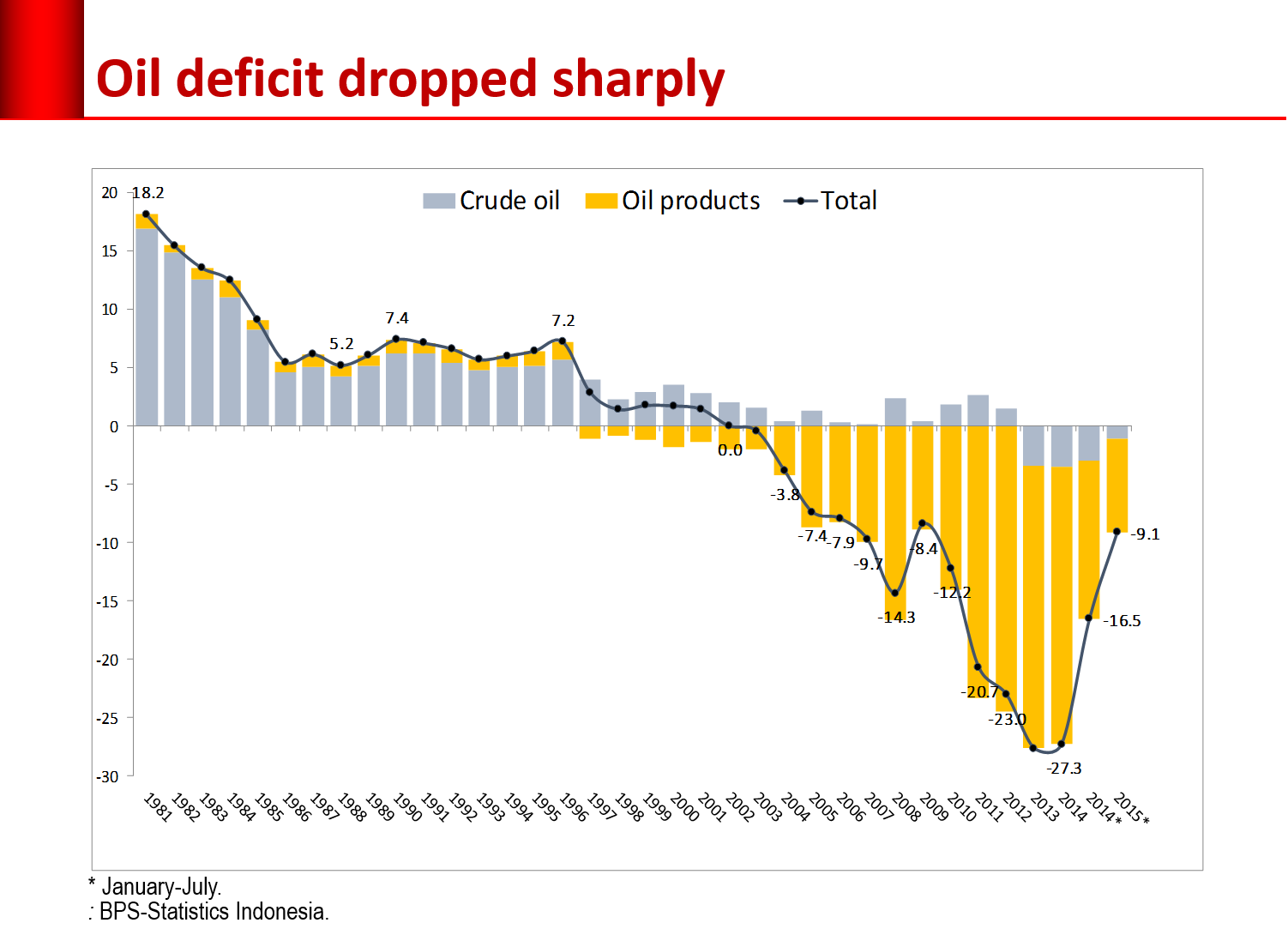 Sayangnya, perbaikan transaksi perdagangan lebih disebabkan oleh impor yang turun lebih tajam ketimbang penurunan ekspor. Impor pada bulan Juli merosot 28,44 persen dibandingkan bulan yang sama tahun lalu dan merosot 22,36 persen dibandingkan bulan sebelumnya (Juni 2015). Penurunan impor terjadi baik untuk migas maupun nonmigas, masing-masing sebesar 45,02 persen dan 21,46 persen untuk month-to-month. Penurunan impor, khususnya nonmigas, mengindikasikan produksi semakin lesu, mengingat kandungan impor cukup tinggi bagi kebanyakan industri kita. Mengingat pula produk industri manufaktur yang berorientasi ekspor cukup banyak yang bergantung pada bahan baku/penolong impor. Dengan kata lain, produk ekspor kita memiliki kandungan impor cukup besar. Porsi impor bahan baku/penolong dalam impor total mencapai 75.,65 persen.