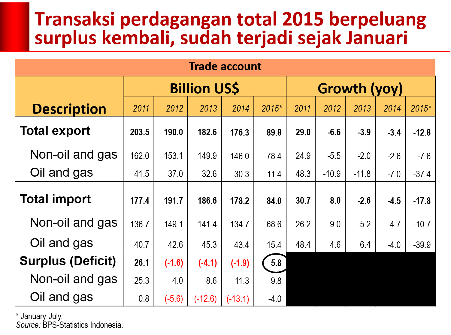 Hari ini (18/8/29015), Badan Pusat Statistik merilis data perdagangan luar negeri (ekspor dan impor) terbaru. Transaksi perdagangan Juli membukukan surplus bulanan tertinggi sejak Desember 2013, yaitu sebesar 1,33 miliar dollar AS, sehingga menambah akumulasi surplus Januari-Juli menjadi5,73 miliar dollar AS.