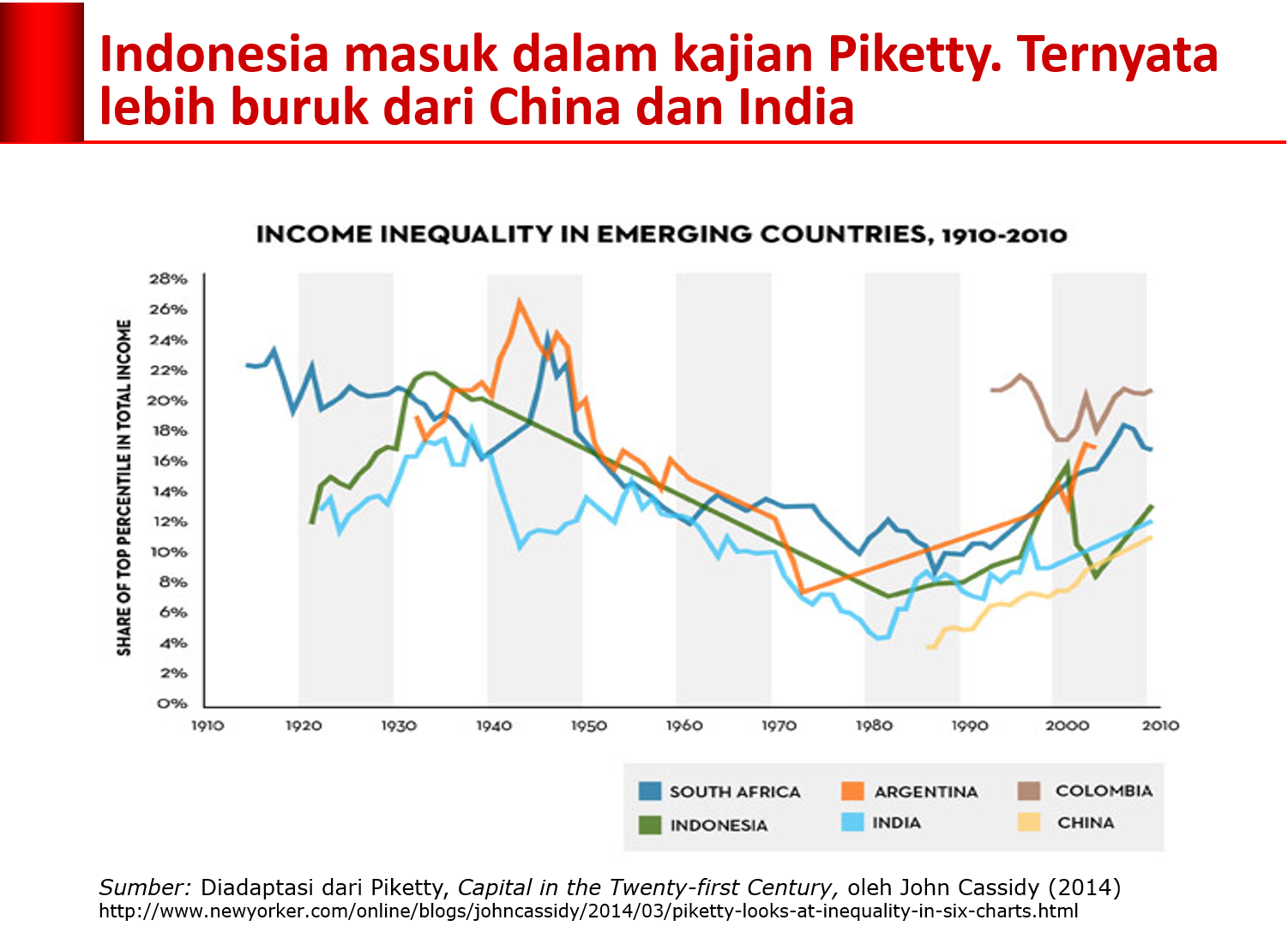 Pertama, kajian Thomas Piketty (buku karanganya Capital in the Twenty-First Century)yang mengunakan proksi yang lebih dekat dengan pendapatan menunjukkan pola perkembangan ketimpangan Indonesia serupa dengan pola negara-negara maju yang mengalami pemburukan ketimpangan, termasuk Amerika Serikat yang paling buruk itu. ketimpangan di Indonesia lebih buruk dari China dan India.