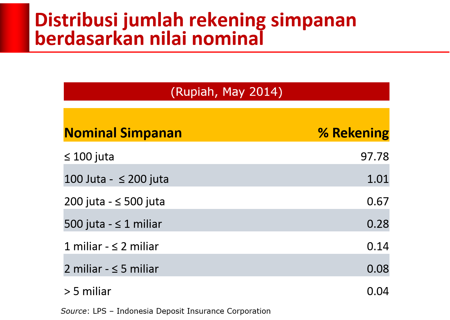 Kedua, struktur kepemilikan simpanan di bank. Ternyata simpanan senilai 100 juta atau kurang sangat dominan, mencapai 97,78 persen rekening. Jumlah rekening dengan nominal Rp 100 juta sampai Rp 300 juta atau kurang hanya 1,01 persen. Selebihnya hanya “nol koma” dan yang di atas Rp 5 miliar hanya 0,04 persen.