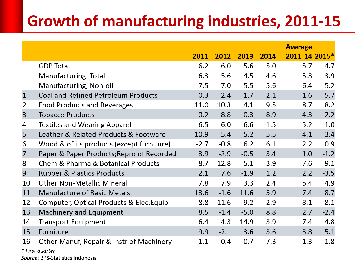 Memasuki tahun 2015, industri manufaktur kian terpuruk. Lima subsektor industri sudah mengalami pertumbuhan negatif, praktis seluruh kelompok industri terkena: migas dan nonmigas, padat karya dan padat modal.