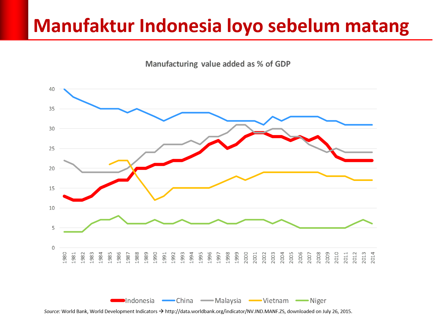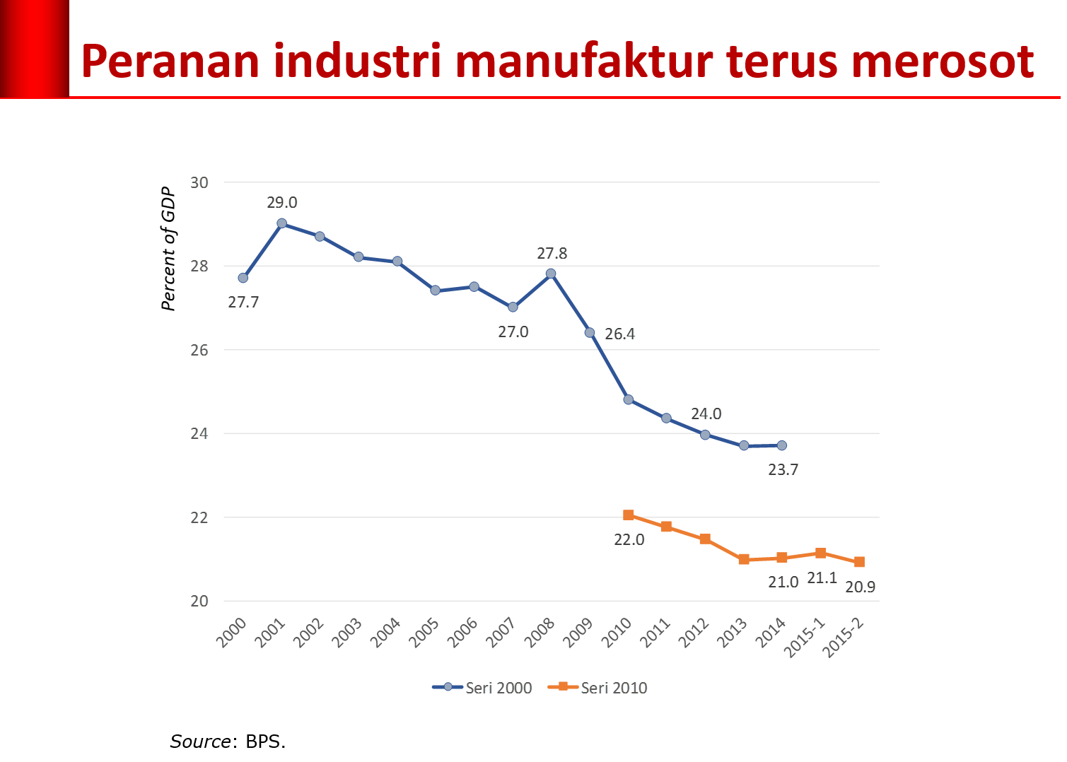 Tak ayal, peranan industri manufaktur dalam PDB mengalami kemerostan persisten. Setelah mencapai tingkat tertinggi pada tahun 2001 sebesar 29 persen, sumbangsih industri manufaktur terus merosot sampai mencapai titik terendah pada triwulan II-2015 sebesar 20,9 persen.
